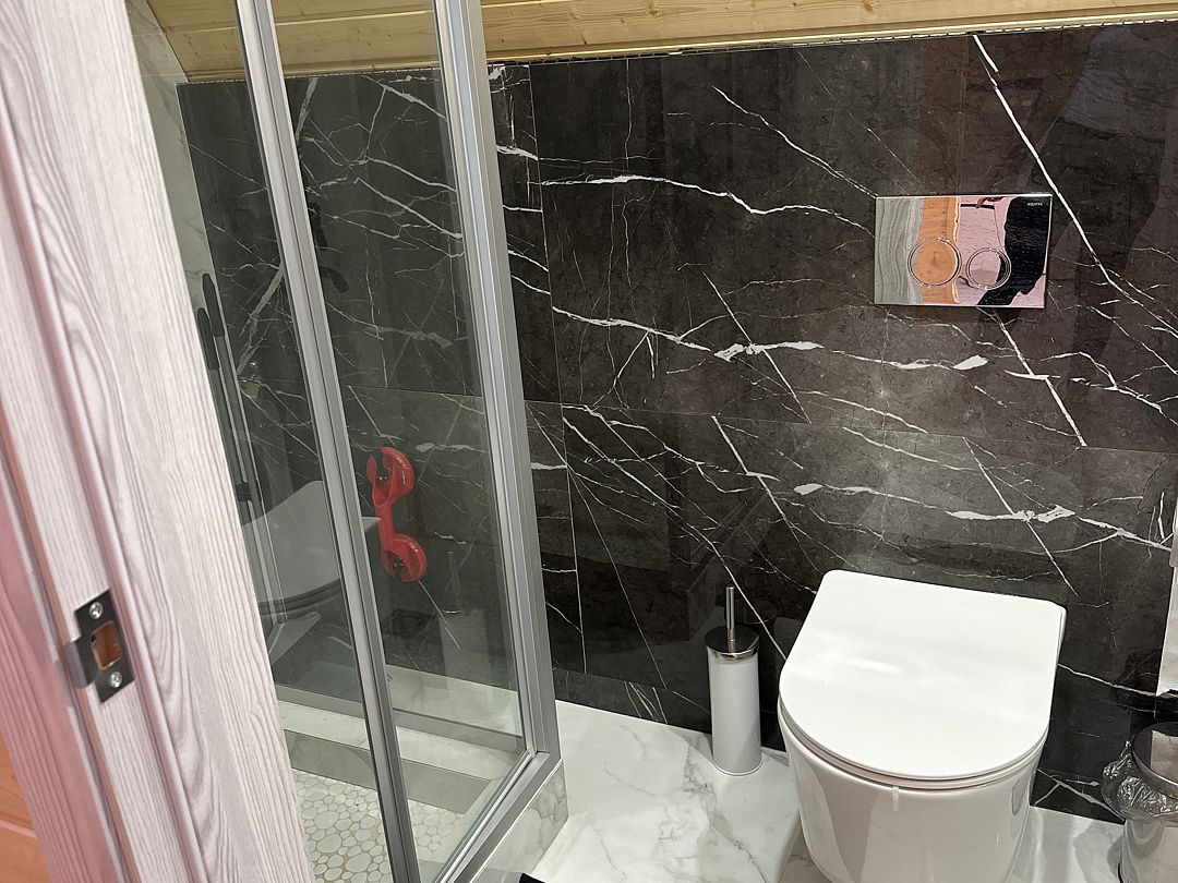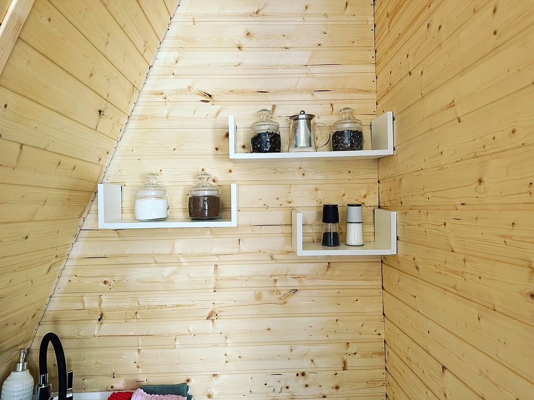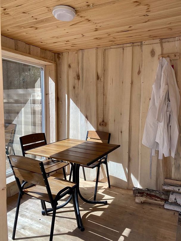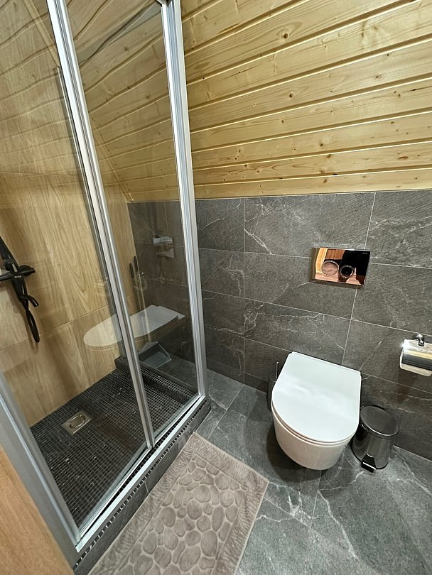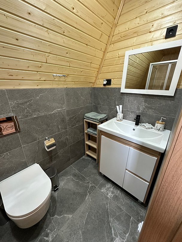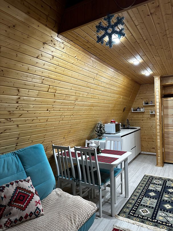 К вашим услугам два двухэтажных дома с панорамными окнами и террасой. На первом этаже расположены просторная кухня-гостиная и санузел, а на втором — уютная спальня. Кухня оснащена всем необходимым: холодильником, микроволновой печью, электрическим чайником и посудой на шесть персон. В спальне вас ждет большой эргономичный матрас и качественное постельное белье, обеспечивающие комфортный сон. В санузле есть душевая кабина, унитаз, фен, а также предоставляются полотенца, шампунь, гель для душа и мыло для рук.
