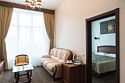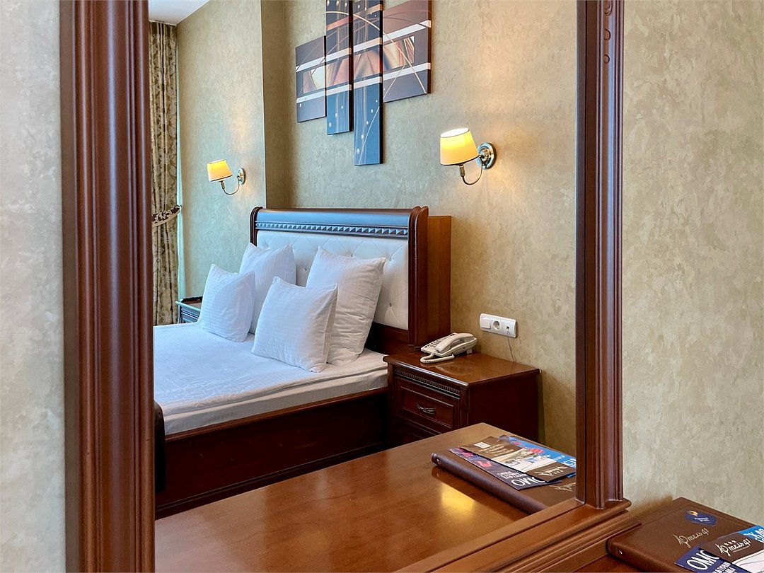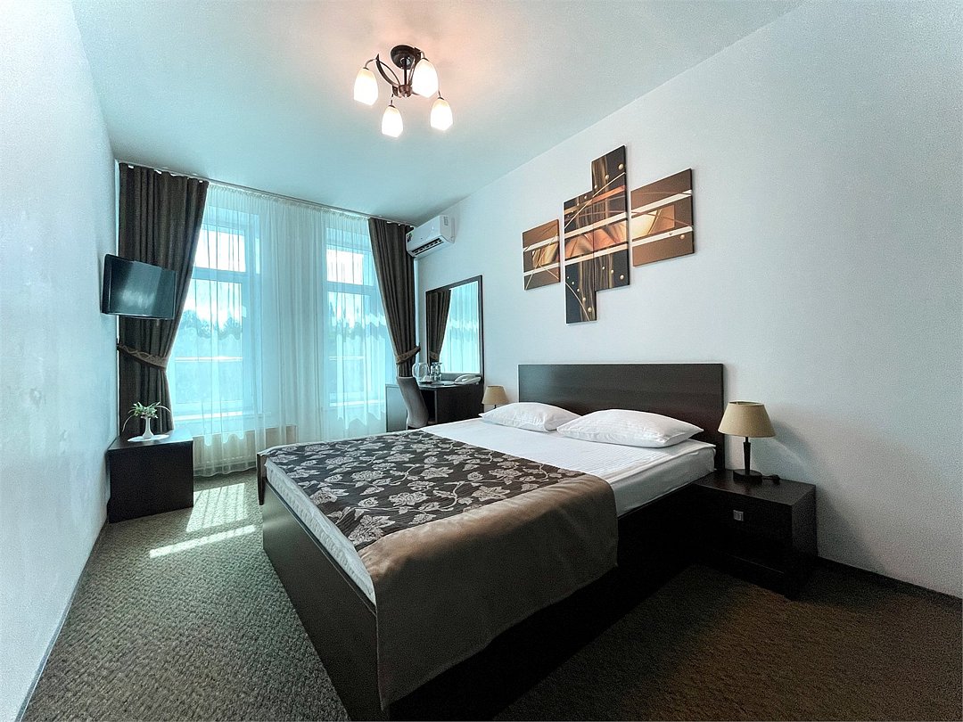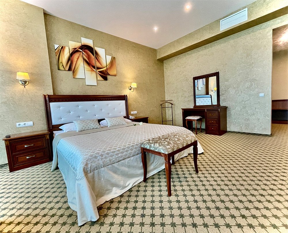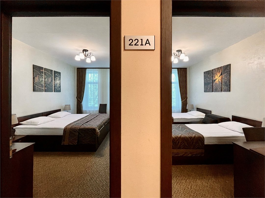 Просторный двухкомнатный номер для комфортного семейного размещения до 6-ти человек. В одной из комнат кровать размером 180Х200, во второй комнате две кровати размером 90х200 или в номере четыре односпальные кровати. В каждой комнате имеется телевизор. В коридоре большой шкаф-купе, есть мини-холодильник.Услуги и удобства