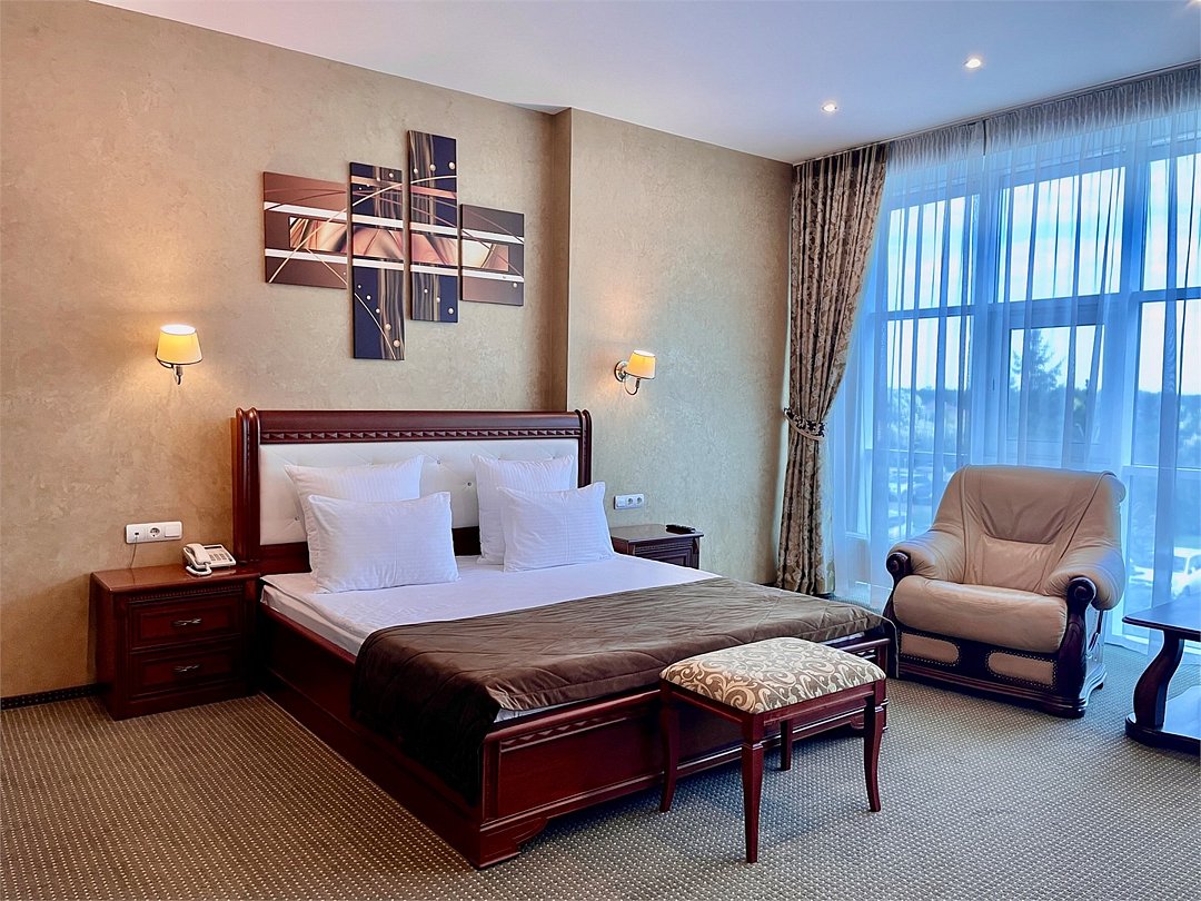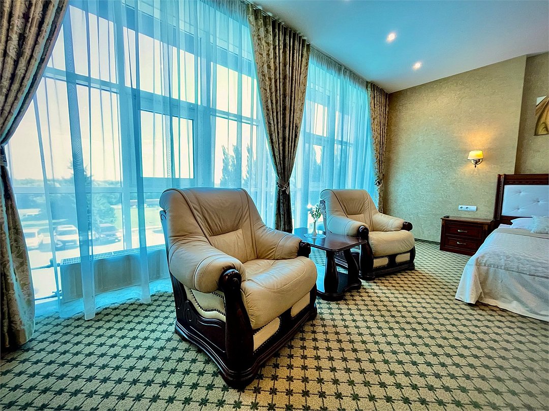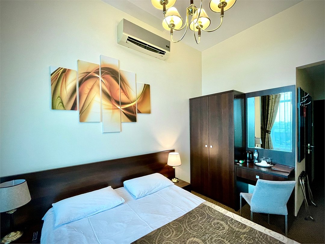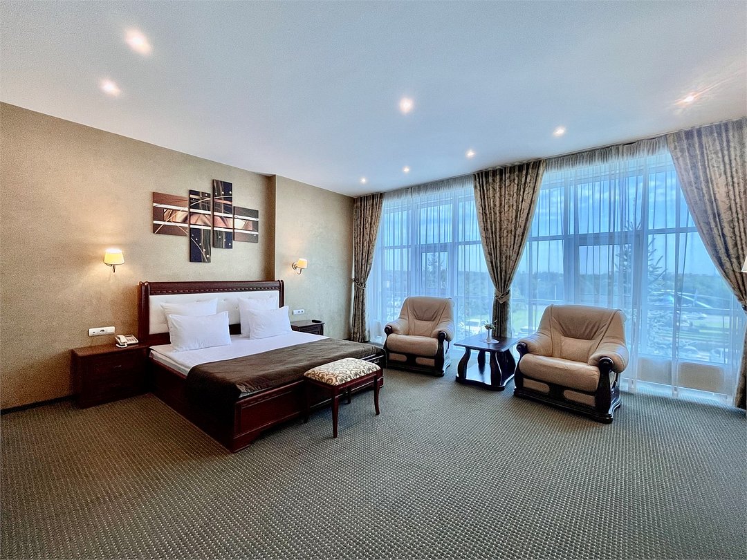 Номер высшей категории с панорамными окнами и видом на вертолёт. В ванной комнате душ. Расположен на 2-м этаже. Единственный такой в отеле.Услуги и удобства