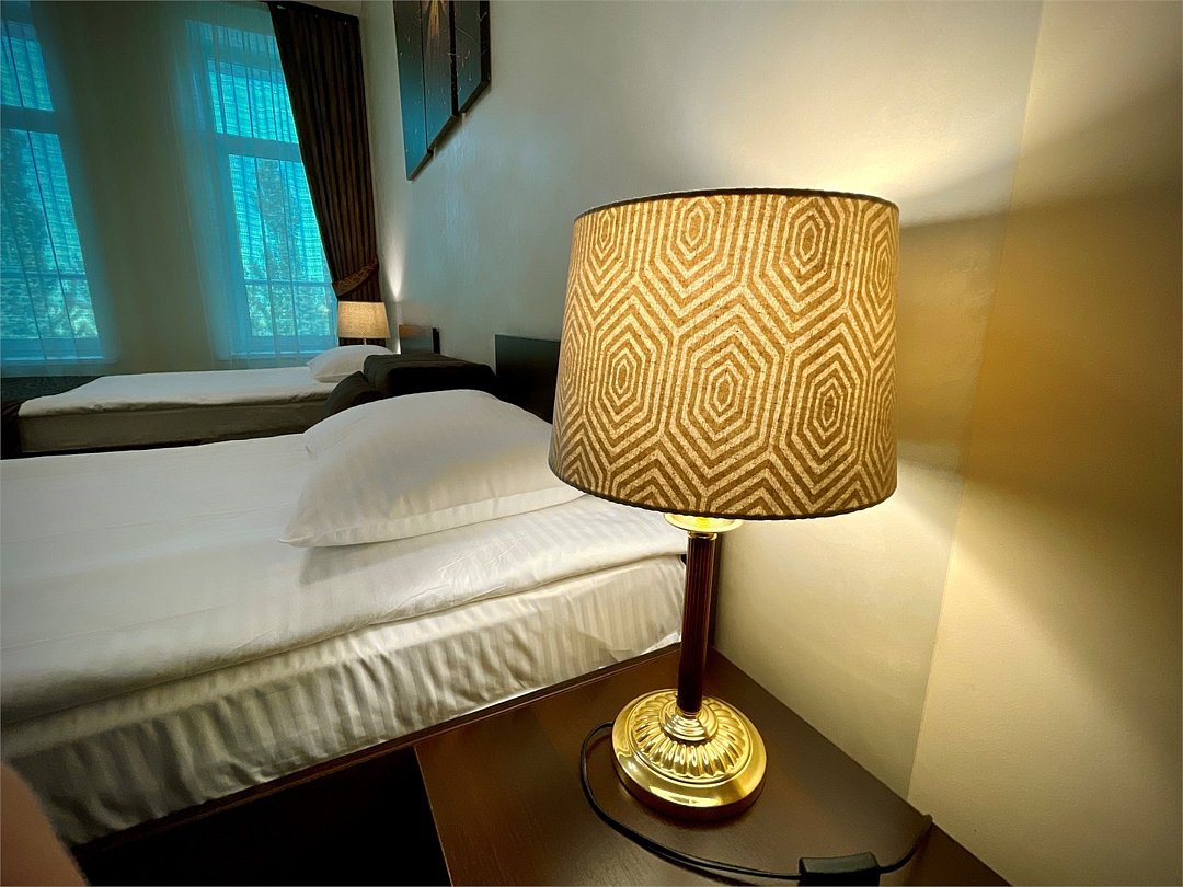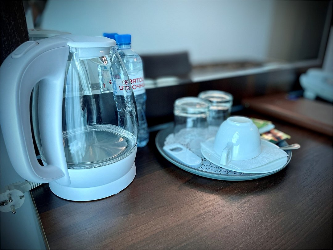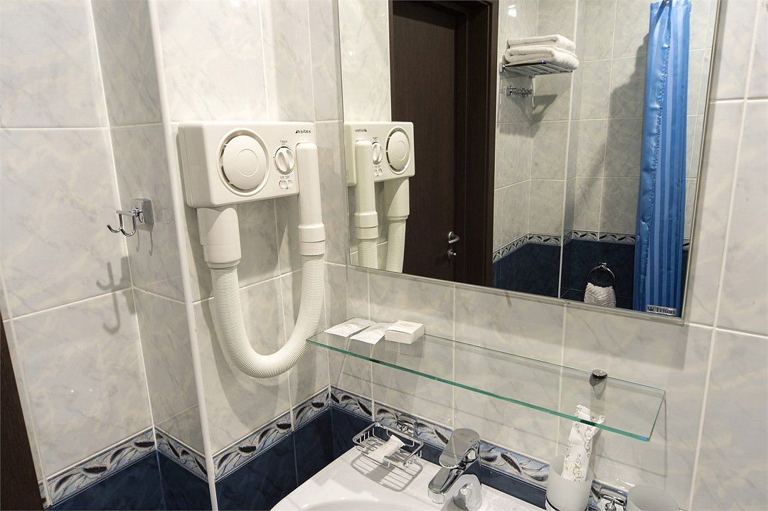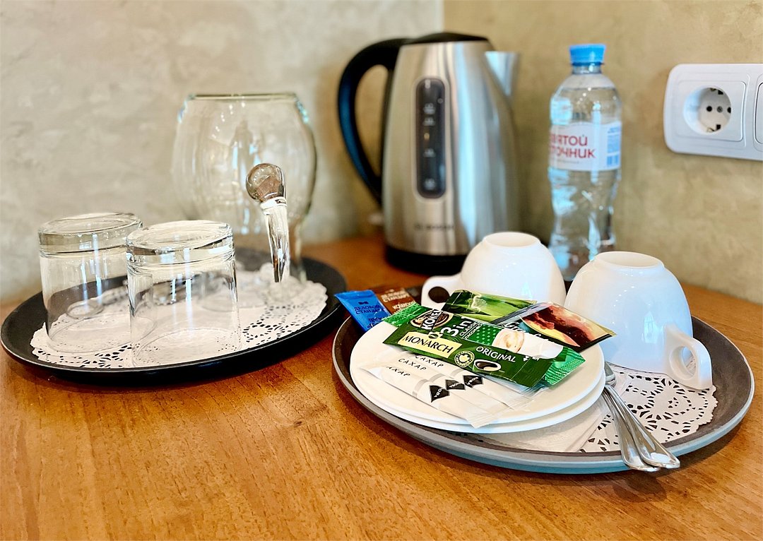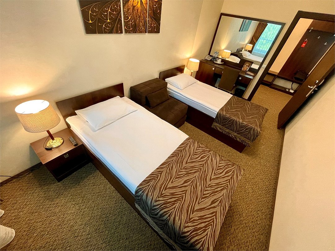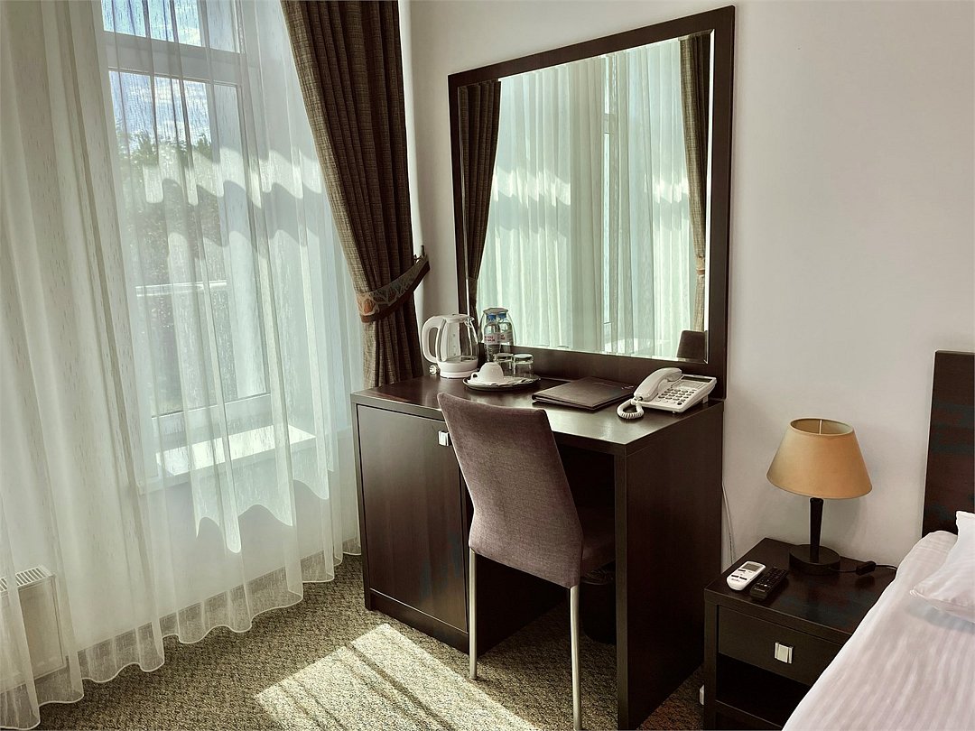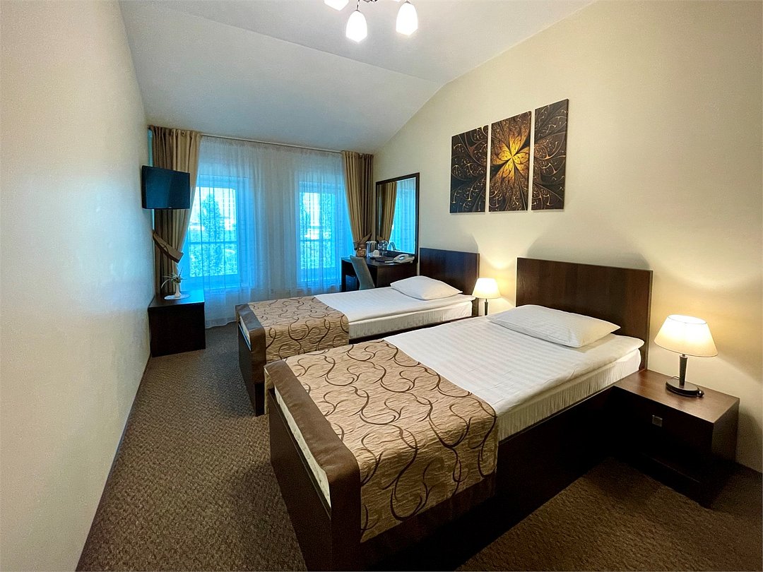 телевизор, кабельное телевидение, Wi-Fi, телефон, настольные лампы, фен, электронные замки, банные полотенца, тапочки, гигиенические средства, две односпальные кровати, тумбы, шкаф для одежды, журнальный столик, письменный стол, багажная тумба, зеркало, чайный набор, информационная карта, меню, чайник, унитаз, раковина, ковровое покрытие, отопление, душ, вид во двор, стаканы, стул, мини-холодильник, москитная сетка, уборка номера, услуги прачечной (платно), вешалки-плечики, бутилированная вода, шапочка для душа, затемняющая штора, без питомцевВ номере