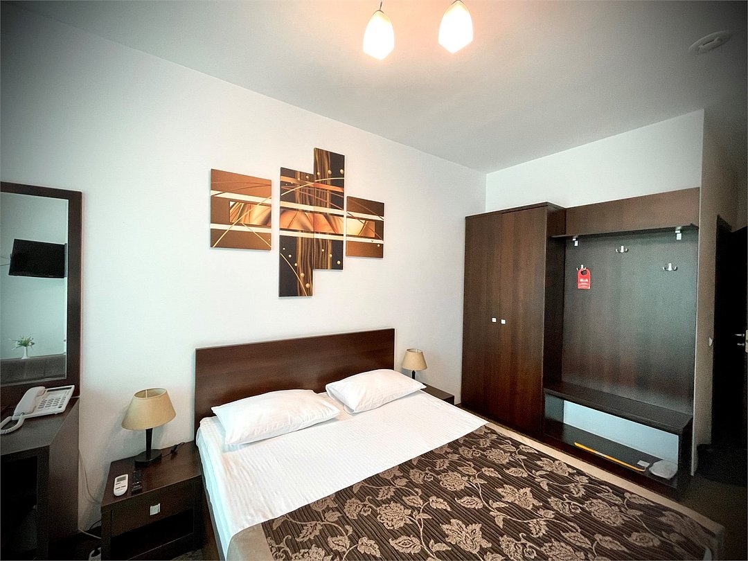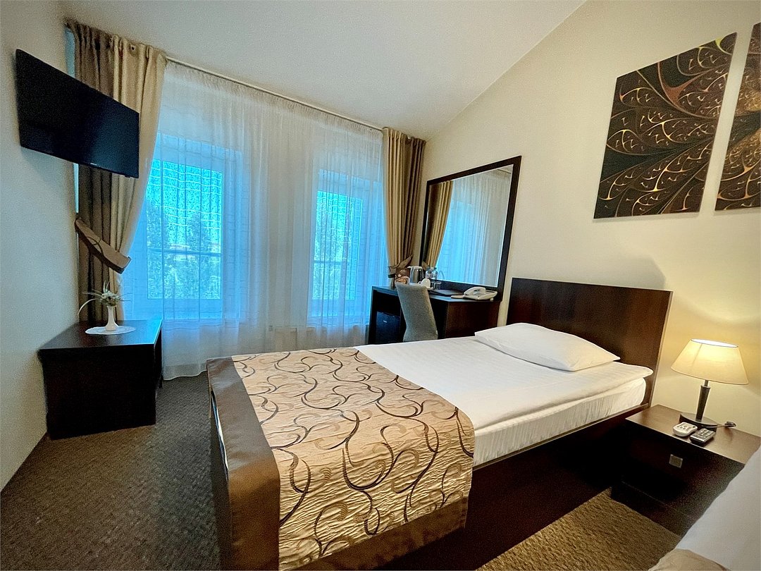 телевизор, кабельное телевидение, Wi-Fi, телефон, настольные лампы, фен, электронные замки, ванная комната, банные полотенца, тапочки, гигиенические средства, двуспальная кровать, тумбы, шкаф для одежды, журнальный столик, письменный стол, багажная тумба, зеркало, чайный набор, информационная карта, меню, чайник, унитаз, раковина, ковровое покрытие, отопление, душ, вид во двор, стаканы, стул, мини-холодильник, москитная сетка, уборка номера, услуги прачечной (платно), вешалки-плечики, бутилированная вода, шапочка для душа, затемняющая штора, без питомцевВ номере