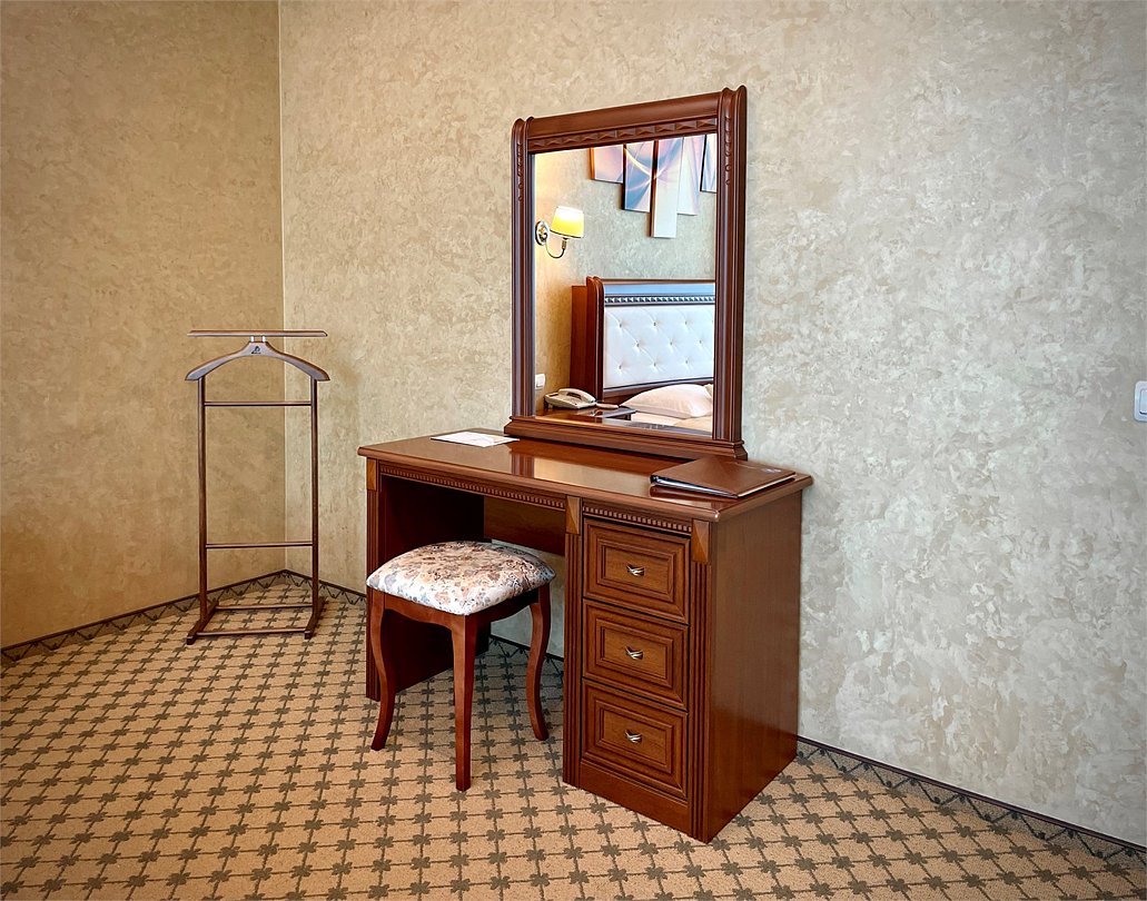 два телевизора, кабельное телевидение, Wi-Fi, телефон, настольные лампы, фен, электронные замки, санузел, банные полотенца, тапочки, гигиенические средства, кровать «King size», две односпальные кровати, тумбы, стулья, вешалки, журнальный столик, письменный стол, багажная тумба, зеркало, две комнаты, чайный набор, чайник, унитаз, раковина, ковровое покрытие, отопление, душ, вид во двор, стаканы, раскладное кресло, мини-холодильник, москитная сетка, шкаф-купе, уборка номера, услуги прачечной (платно), вешалки-плечики, бутилированная вода, шапочка для душа, затемняющая штора, без питомцевВ номере