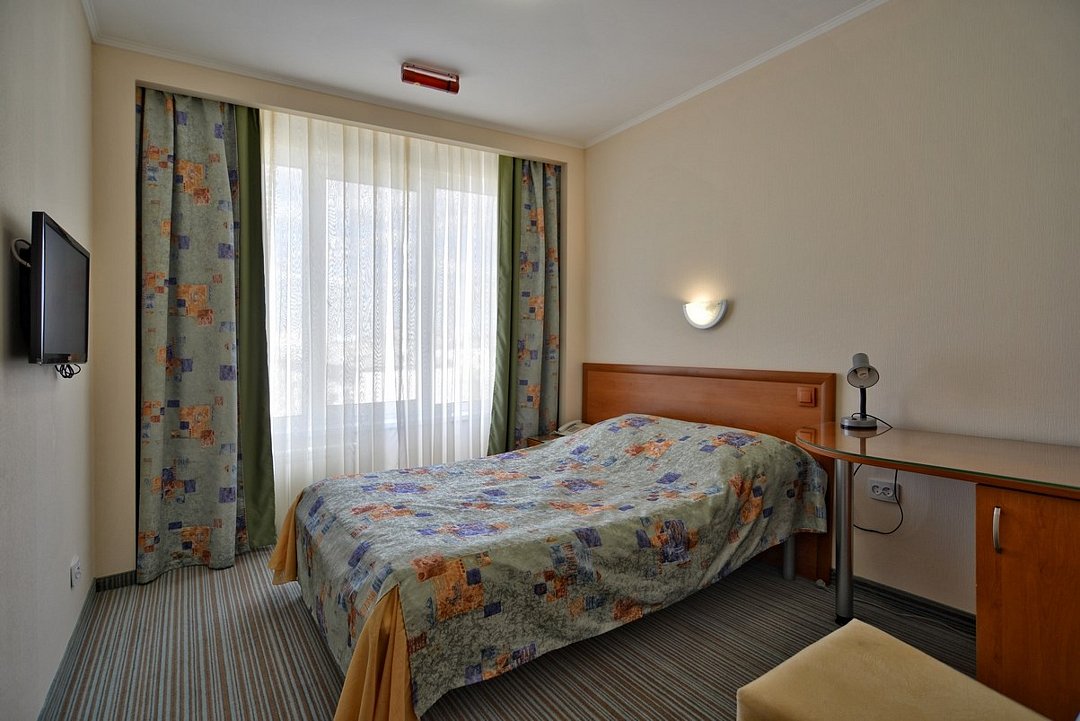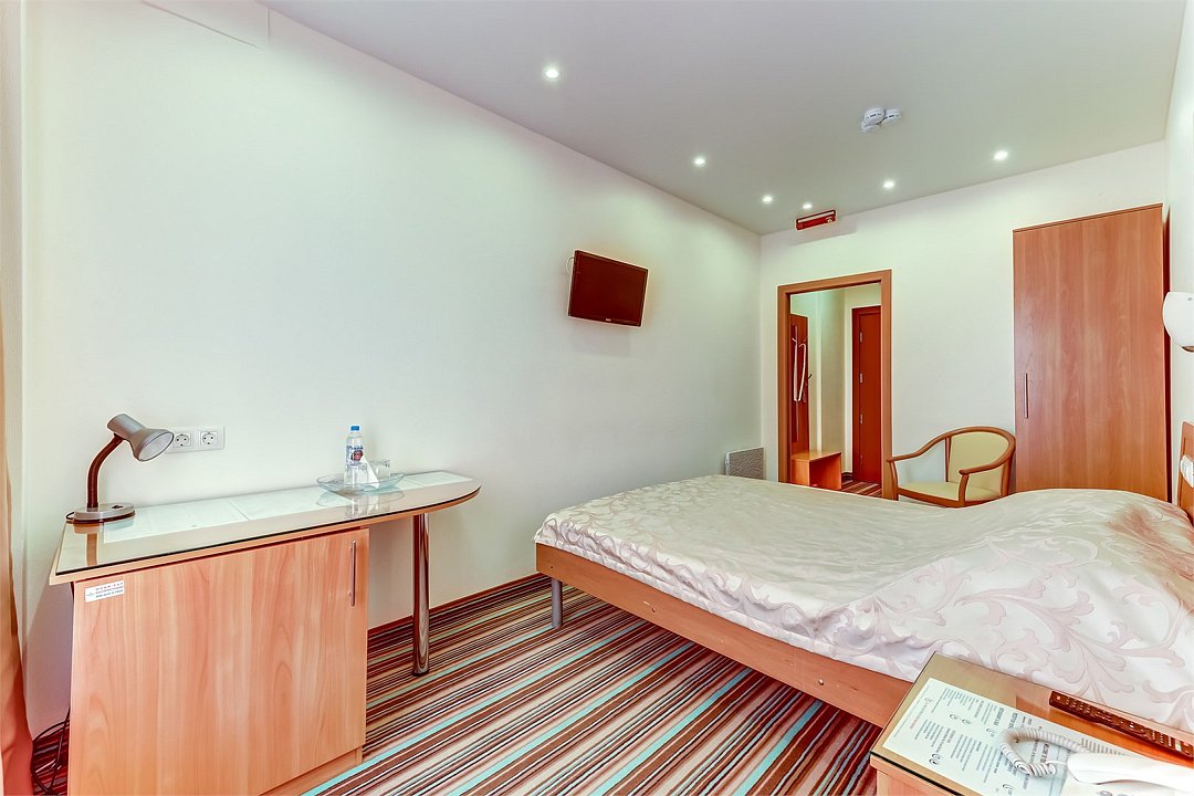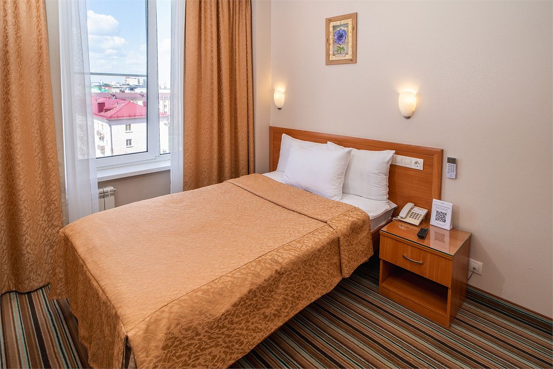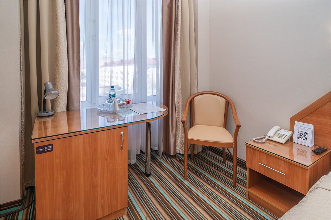 телевизор, Wi-Fi, телефон, светильник, настольные лампы, фен, система безопасности, электронные замки, ванная комната, ванна или душевая кабина, банные полотенца, тапочки, гигиенические средства, косметические средства, полутораспальная кровать, шкаф для одежды, вешалки, зеркало, мини-бар, обслуживание номеров, информационная карта, меню, унитаз, раковина, питьевая вода, ковровое покрытие, отопление, вид на город, кулер на этаже, вид на реку, стаканы, стул, стол, тумба, туалетные средства, мини-холодильник, номер для некурящих, можно с питомцамиВ гостиничном номере
