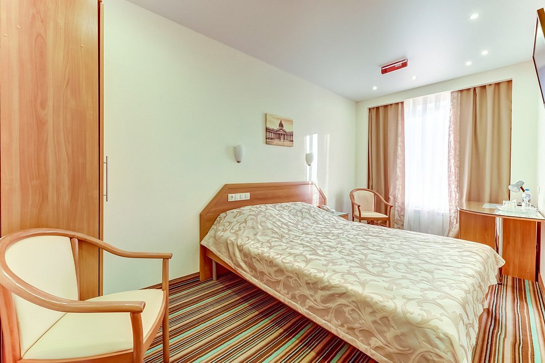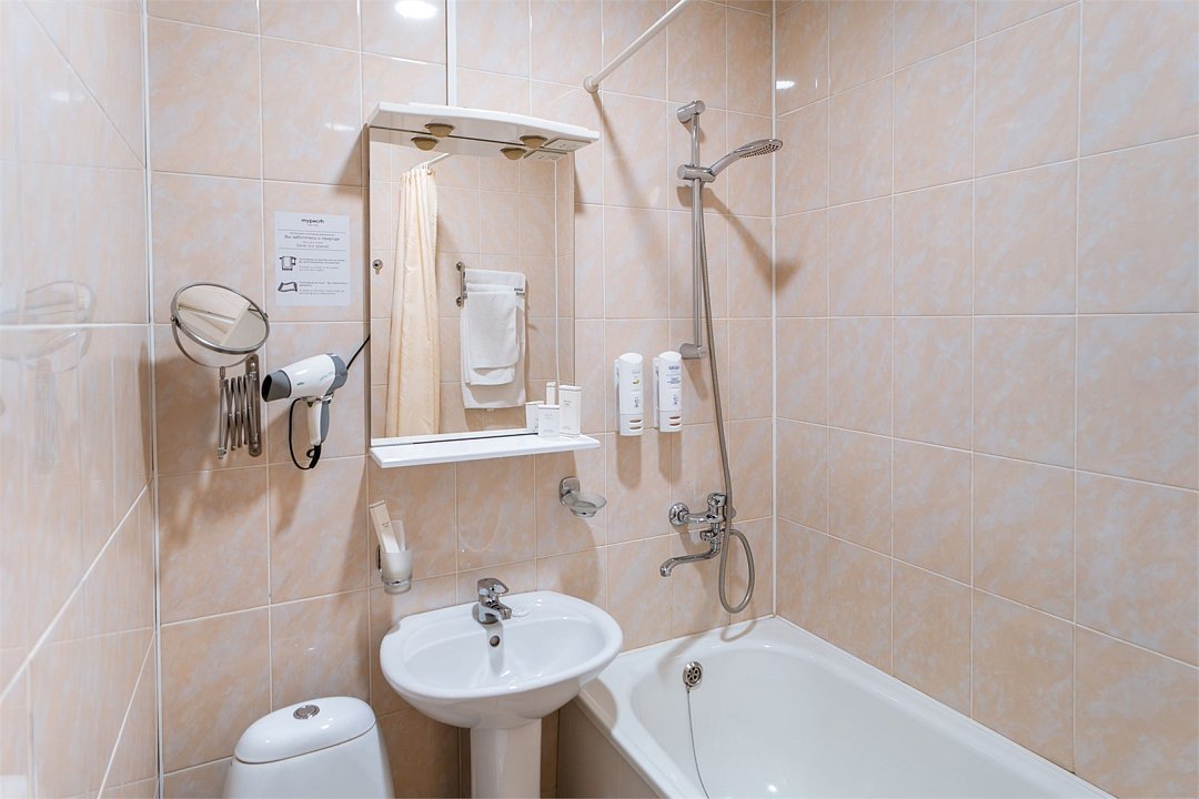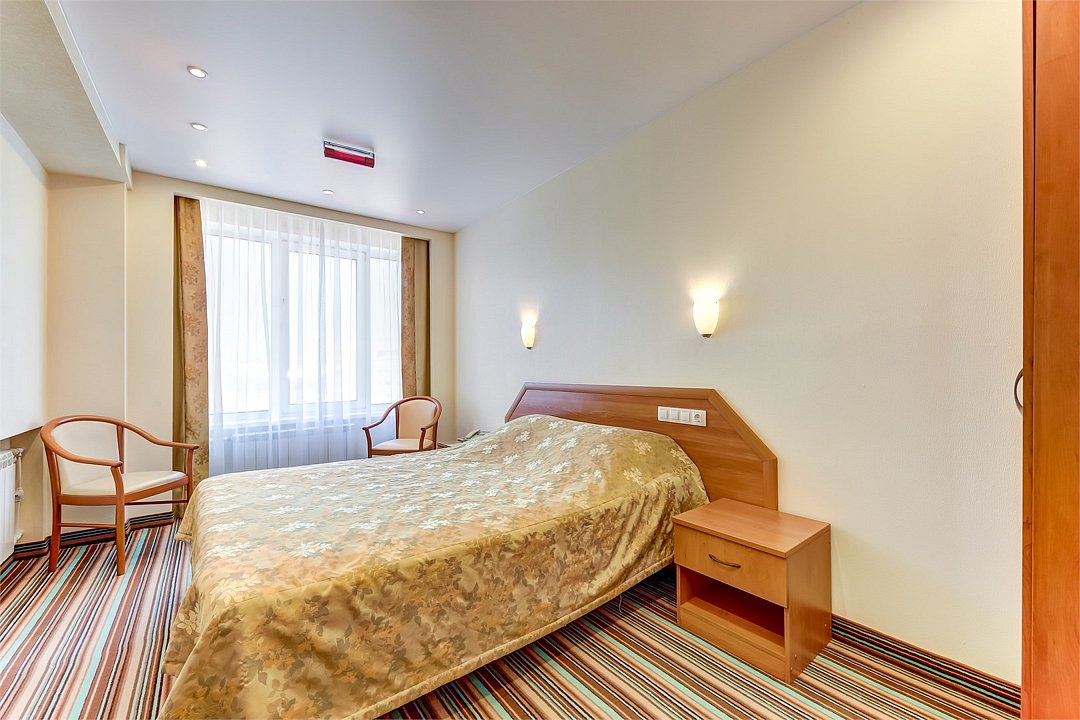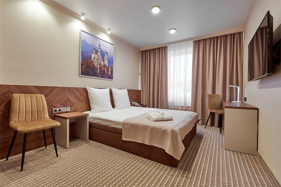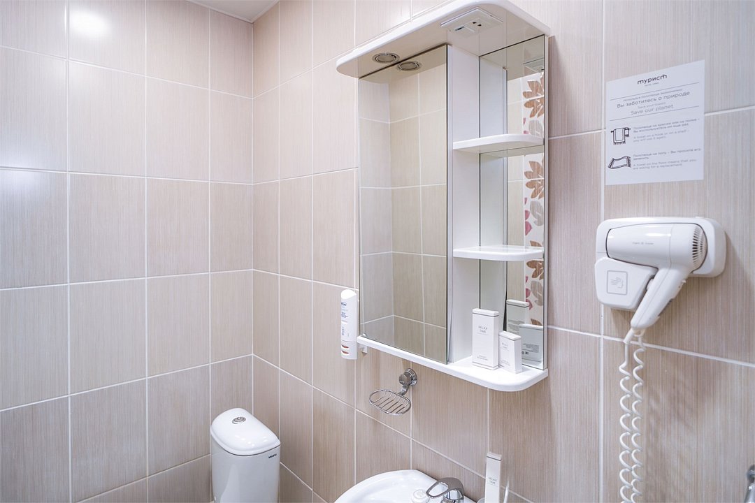 телевизор, Wi-Fi, телефон, светильник, настольные лампы, фен, система безопасности, электронные замки, ванная комната, ванна или душевая кабина, банные полотенца, тапочки, гигиенические средства, косметические средства, полутораспальная кровать, шкаф для одежды, вешалки, зеркало, мини-бар, обслуживание номеров, информационная карта, меню, унитаз, раковина, питьевая вода, ковровое покрытие, отопление, вид на город, кулер на этаже, вид на реку, стаканы, стул, стол, тумба, туалетные средства, мини-холодильник, номер для некурящих, можно с питомцамиВ гостиничном номере