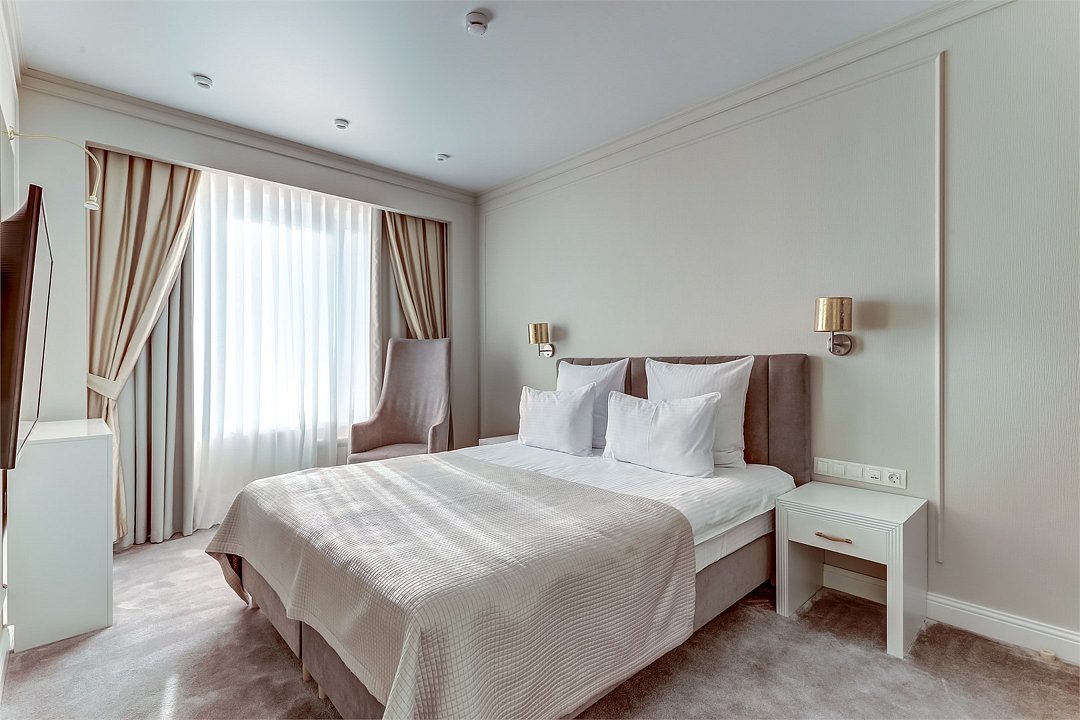 Wi-Fi, телефон, светильник, настольные лампы, фен, система безопасности, электронные замки, ванна или душевая кабина, банные полотенца, тапочки, гигиенические средства, косметические средства, двуспальная кровать, шкаф для одежды, вешалки, журнальный столик, зеркало, две комнаты, мини-бар, обслуживание номеров, информационная карта, меню, чайник, унитаз, раковина, питьевая вода, гостиная зона, ковровое покрытие, отопление, вид на город, кулер на этаже, стул, тумба, туалетные средства, раскладной диван, телевизор с плоским экраном, мини-холодильник, номер для некурящих, без питомцевВ гостиничном номере