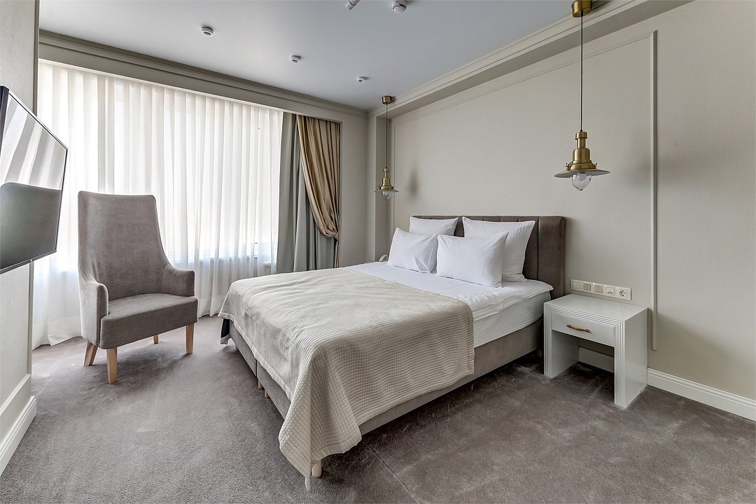 телевизор, Wi-Fi, телефон, светильник, настольные лампы, фен, система безопасности, электронные замки, ванная комната, ванна или душевая кабина, банные полотенца, тапочки, гигиенические средства, косметические средства, двуспальная кровать, шкаф для одежды, вешалки, зеркало, мини-бар, обслуживание номеров, информационная карта, меню, унитаз, раковина, питьевая вода, ковровое покрытие, отопление, вид на город, кулер на этаже, вид на реку, стаканы, стул, стол, тумба, туалетные средства, мини-холодильник, номер для некурящих, можно с питомцамиВ гостиничном номере