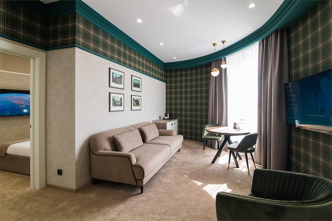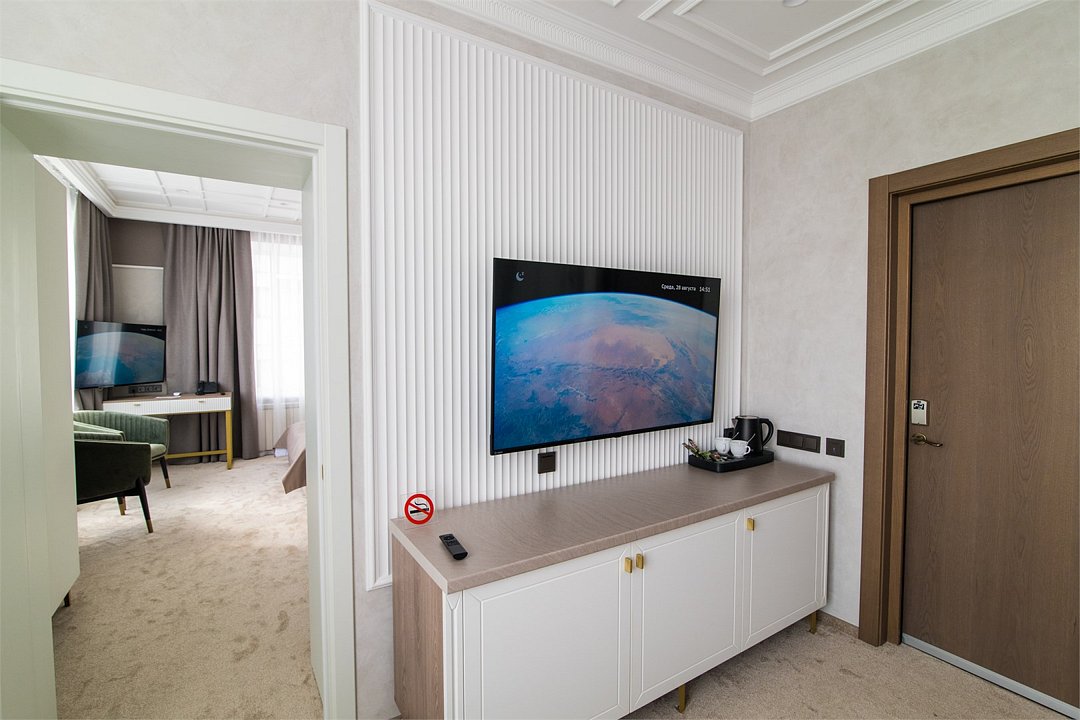 два телевизора, кабельное телевидение, Wi-Fi, телефон, кондиционер, фен, электронные замки, ванная комната, ванна, биде, халаты, банные полотенца, тапочки, гигиенические средства, косметические средства, двуспальная кровать, стулья, шкаф для одежды, вешалки, обеденный стол, багажная тумба, зеркало, чайный набор, унитаз, раковина, косметическое зеркало, кресло, тумба, туалетные средства, раскладной диван, телевизор с плоским экраном, мини-холодильник, гостиничная парфюмерия, без питомцевВ номере