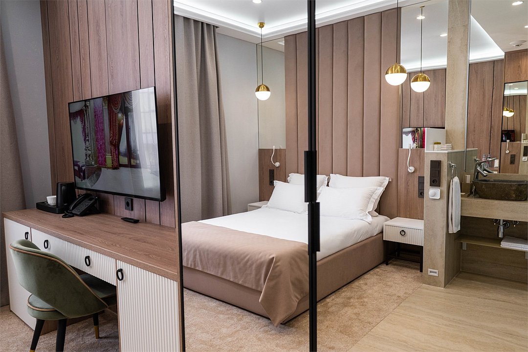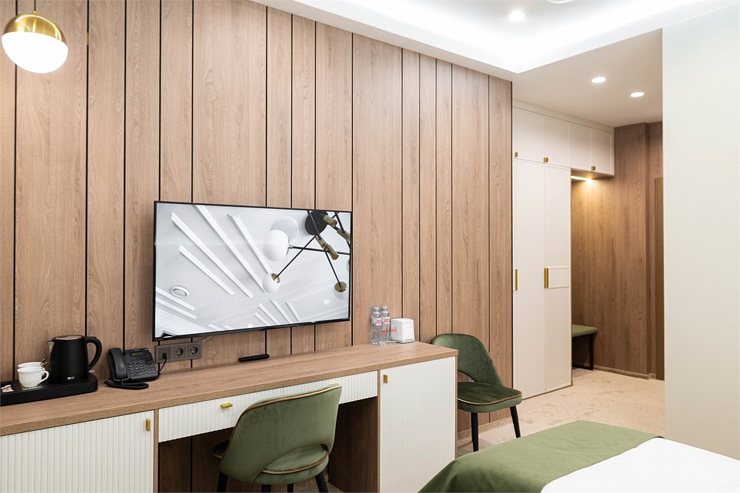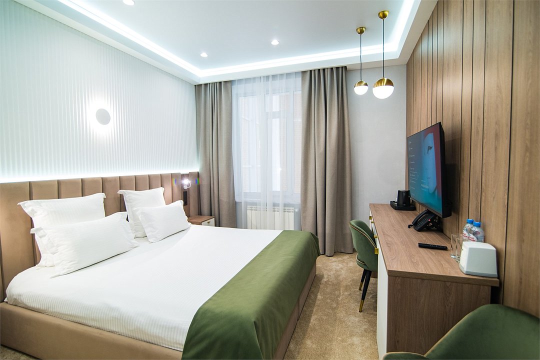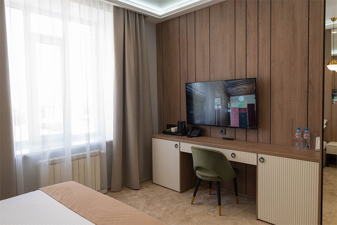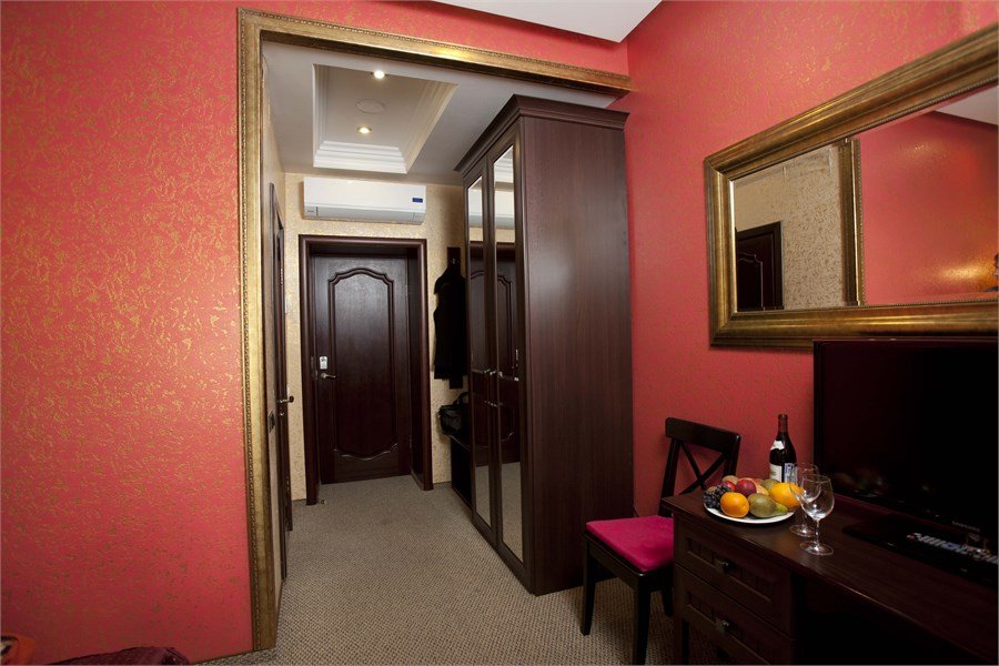 телевизор, кабельное телевидение, Wi-Fi, холодильник, кондиционер, фен, электронные замки, ванная комната, ванна, биде, банные полотенца, тапочки, гигиенические средства, косметические средства, двуспальная кровать, стулья, шкаф для одежды, вешалки, письменный стол, багажная тумба, зеркало, обслуживание номеров, сейф, унитаз, раковина, ковровое покрытие, кулер на этаже, без питомцевВ номере