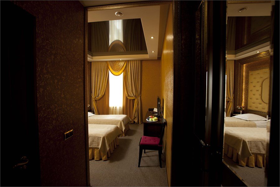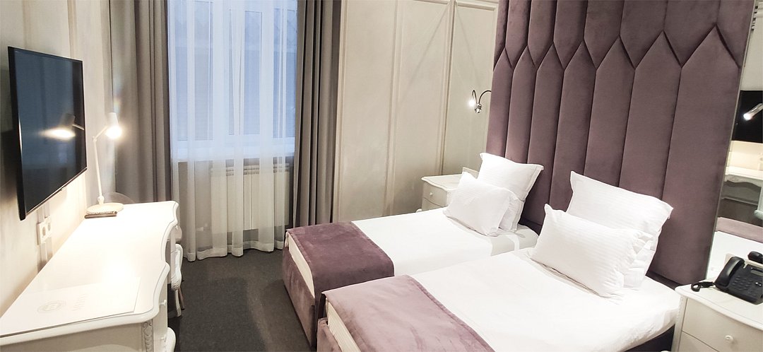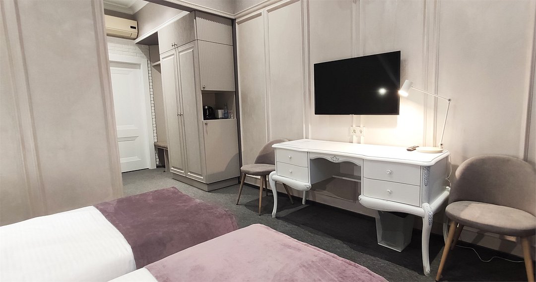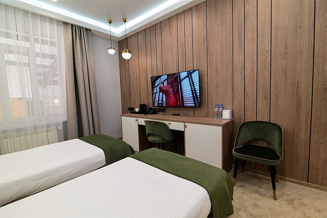 телевизор, кабельное телевидение, Wi-Fi, холодильник, фен, электронные замки, ванная комната, ванна, биде, банные полотенца, тапочки, гигиенические средства, косметические средства, две односпальные кровати, стулья, шкаф для одежды, вешалки, письменный стол, багажная тумба, зеркало, обслуживание номеров, сейф, унитаз, раковина, кулер на этаже, без питомцевВ номере