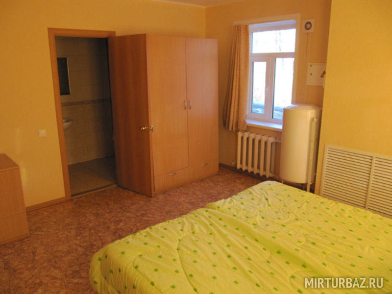 Может одновременно принять до 4-х человек и имеет в наличии четыре односпальные кровати, мебель. Санузел с умывальником оборудован на этаже, отдельно от номера.