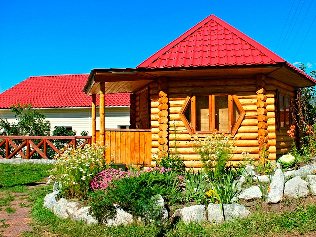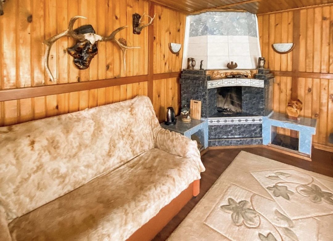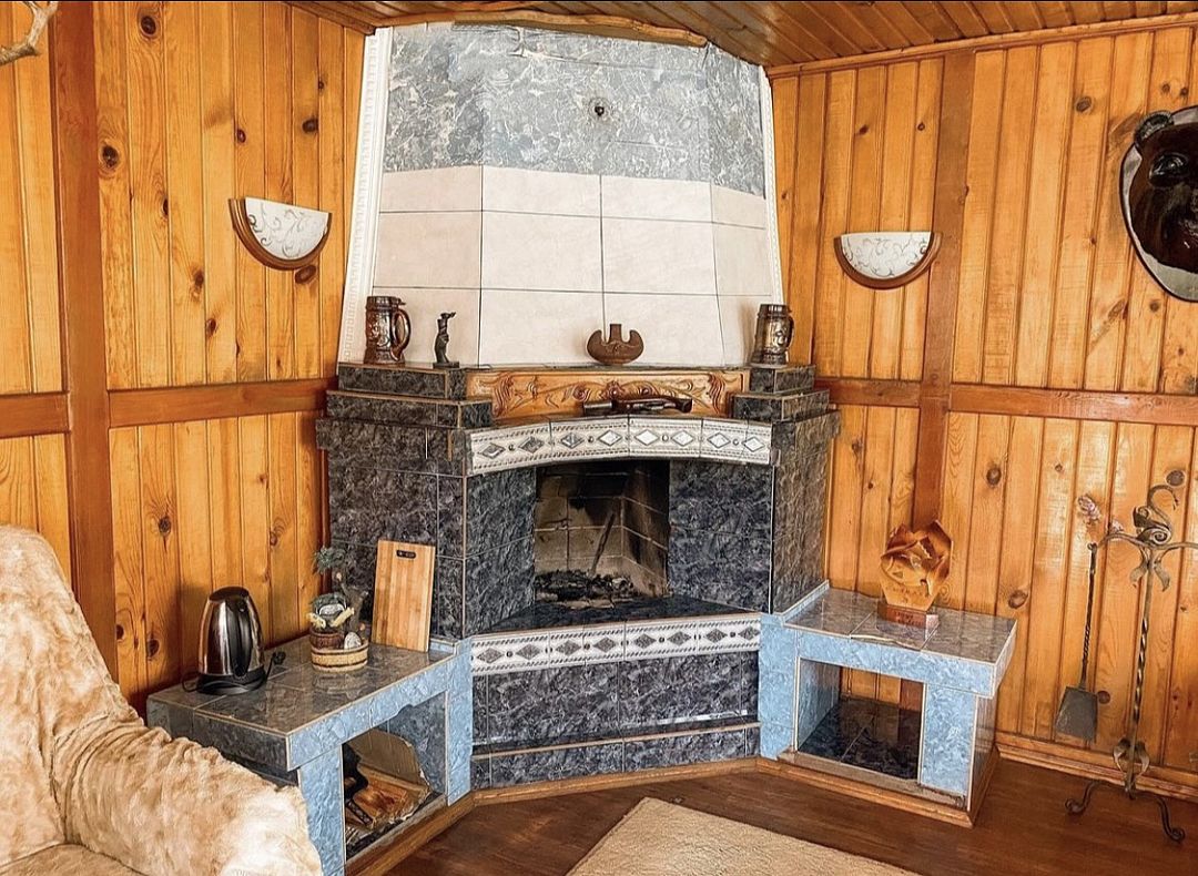 Домик в охотничьем стиле, с собственным камином. Рядом находится круглый бассейн.