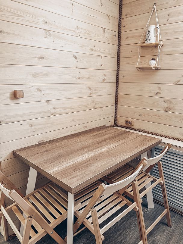 Обеденная зона: стол, диванчик, холодильник, шкаф с посудой, чайник.