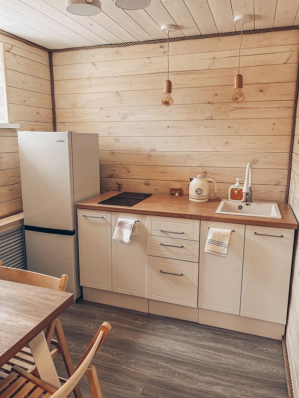 В домике на первом этаже находится прихожая, кухня, душ и туалет, а на втором этаже — две раздельные спальни. Кухня (гарнитур, посуда, плита), санузел (туалет, душевая кабина), 2 комнаты: