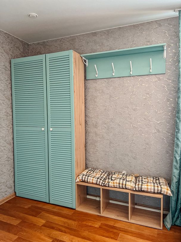 Кухонная зона: гарнитур, гор./хол. вода, посуда, чайник, холодильник. Душ и туалет в коридоре.