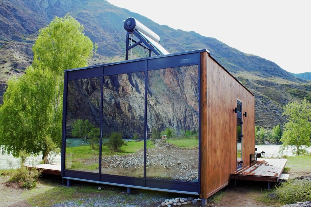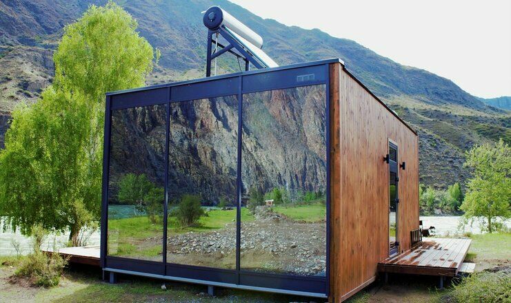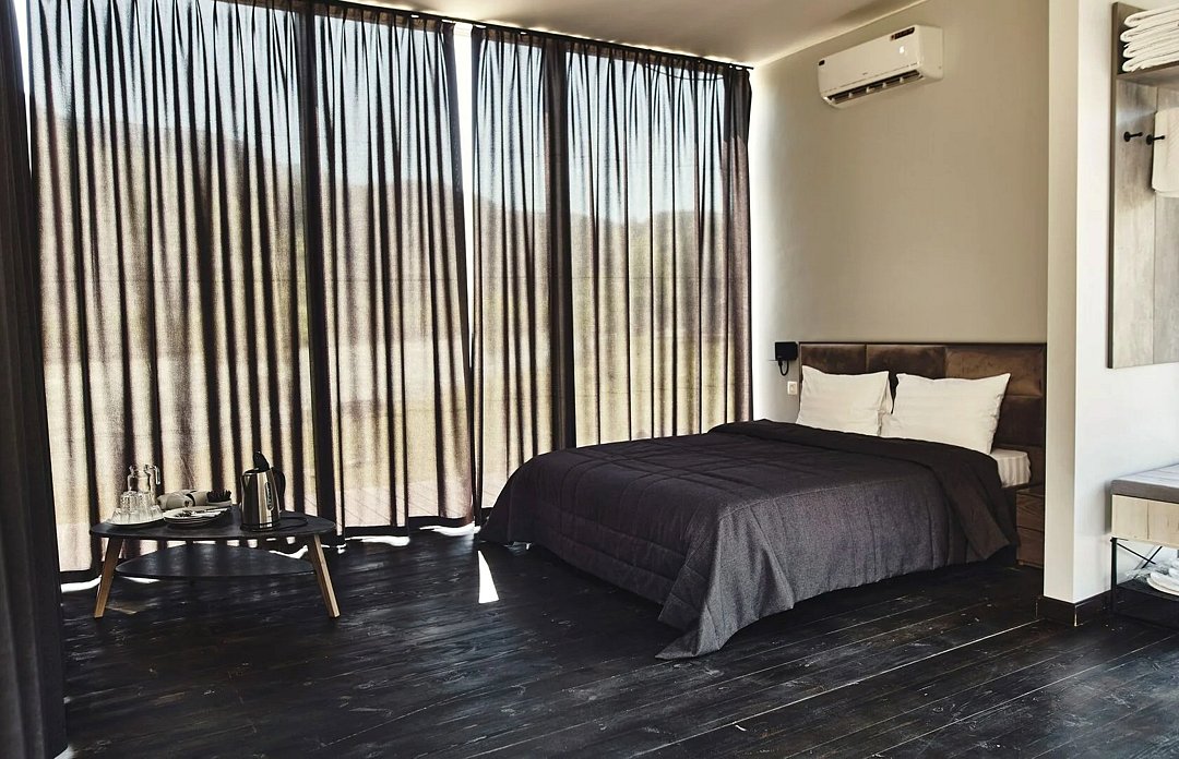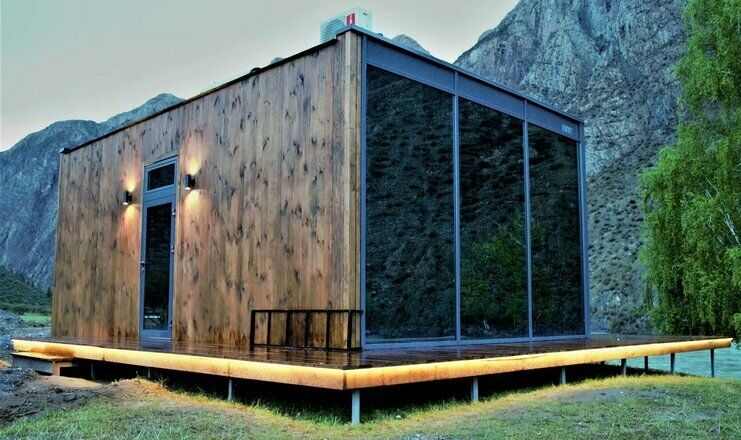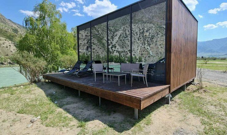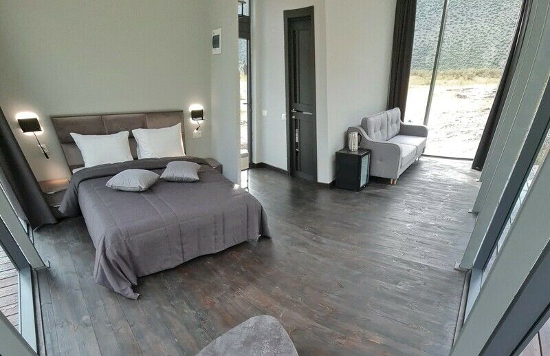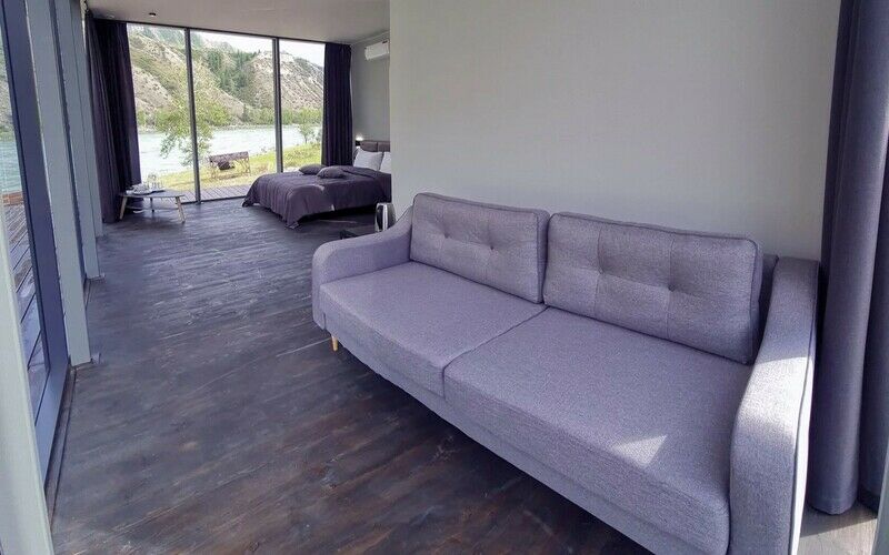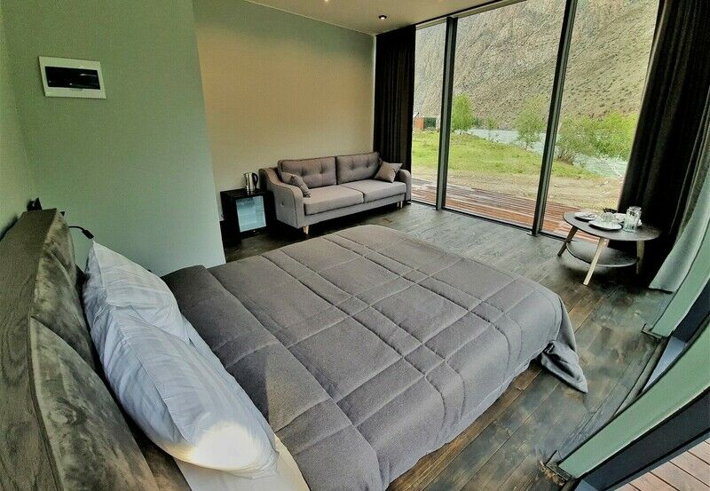 Большая двуспальная кровать, чайный набор, стол, стулья, кондиционер, душ, обогреваемый пол, фен, удобный диван, панорамное стена-окно с видом на Катунь и долину.