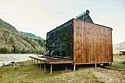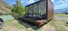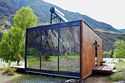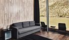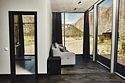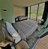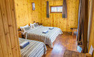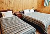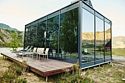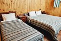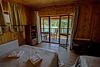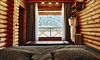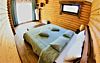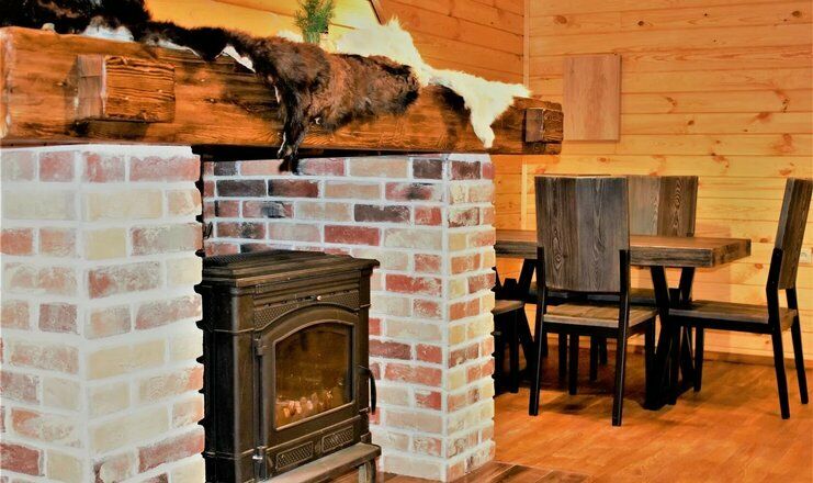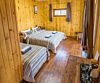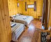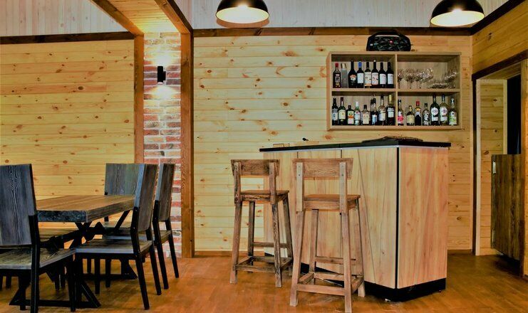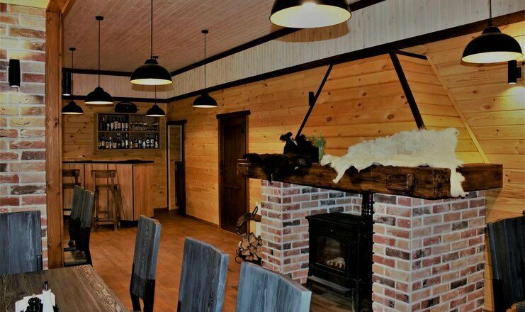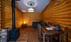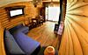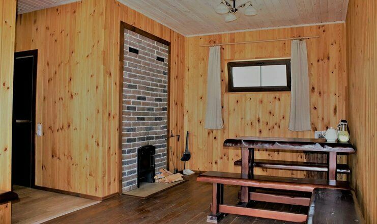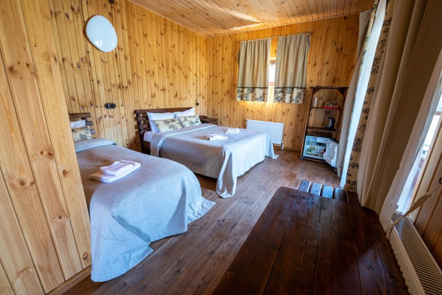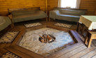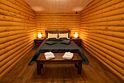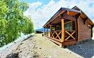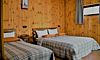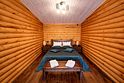 Двухкомнатный семейный коттедж из бруса с панорамными окнами и большой террасой. В одной комнате большая двуспальная кровать, в другой - камин и раcкладной двухместный диван. Один санузел. Комнаты не разделены дверьми.