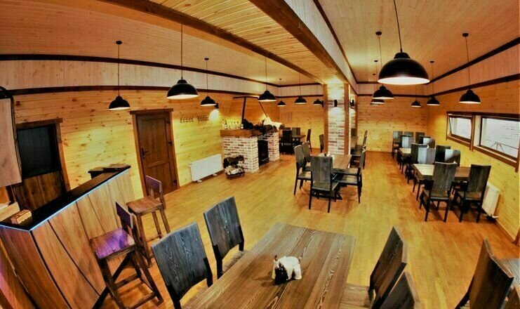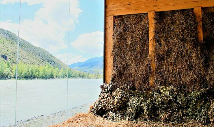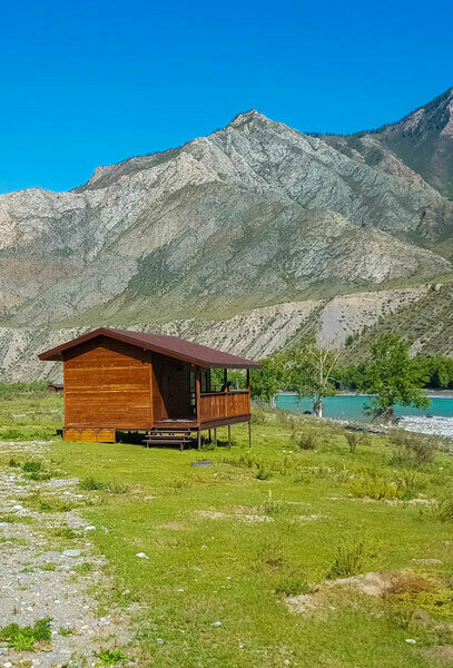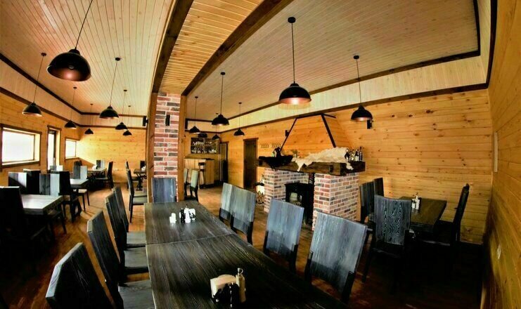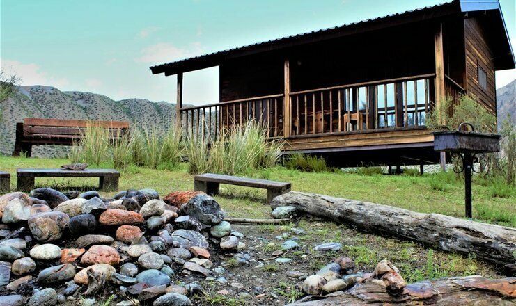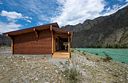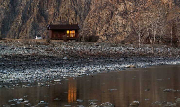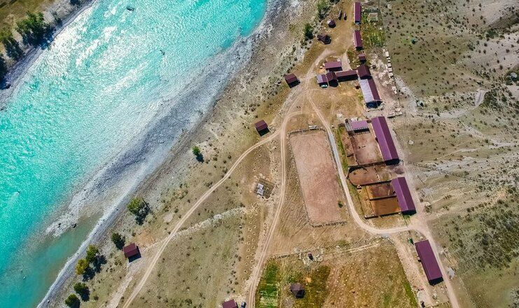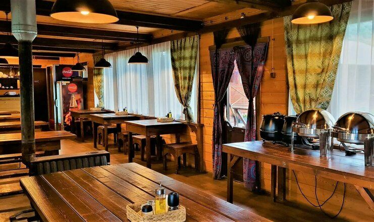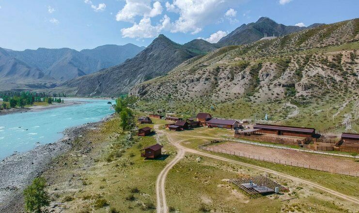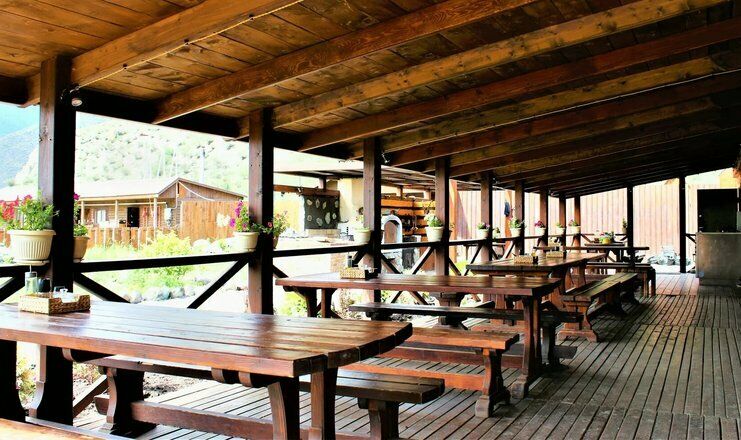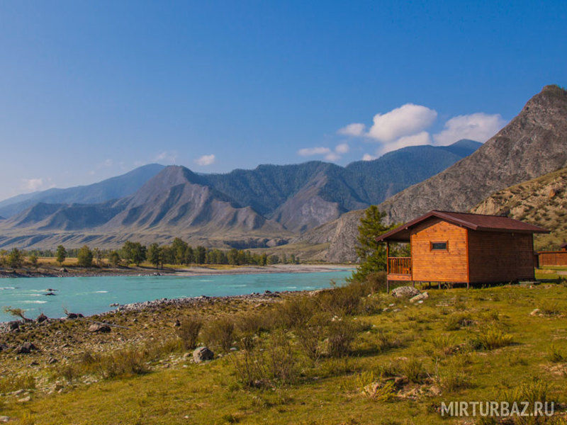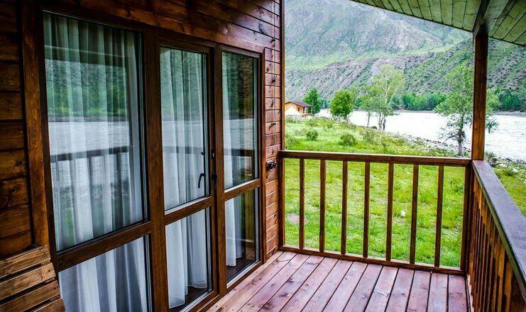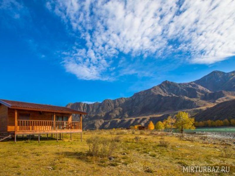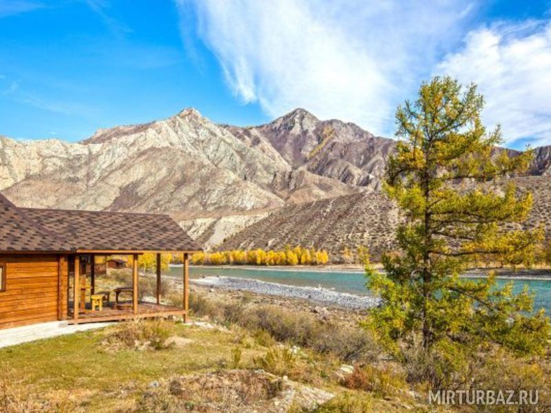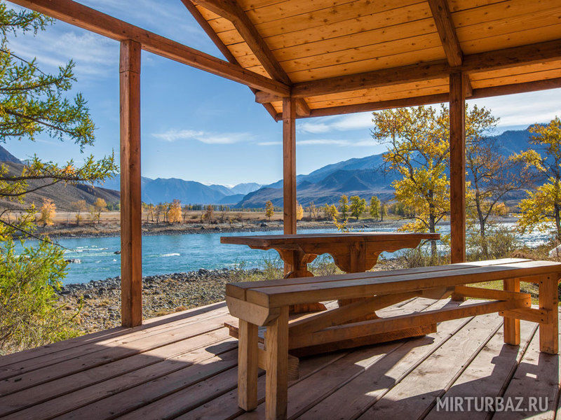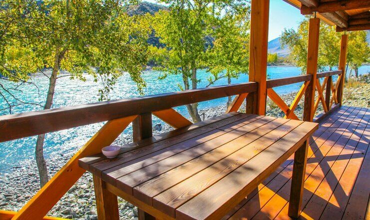 Ресторан базы отдыха окружен алтайскими горами, плавно перетекающими из одного образа в другой. Скалистые вершины, сменяются лесным высокогорьем. Таежный лес плавно переходит в ароматные луга, а правит всем величественная река Алтая - бирюзовая Катунь.