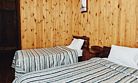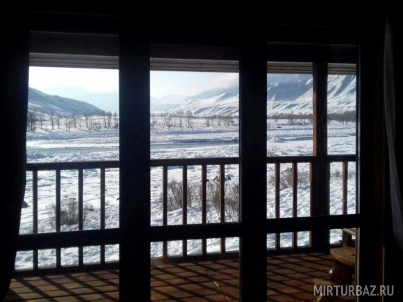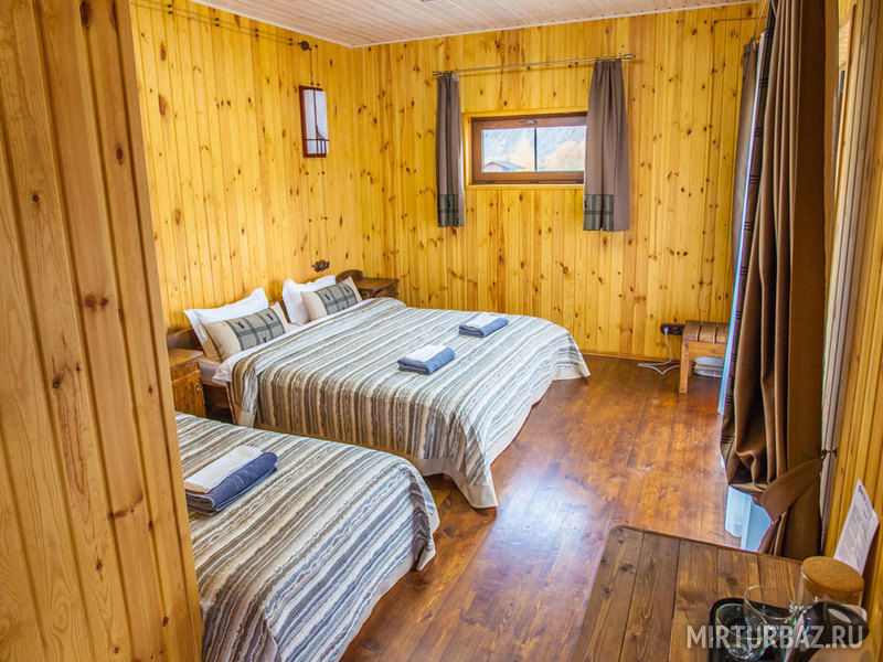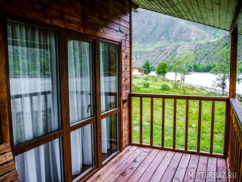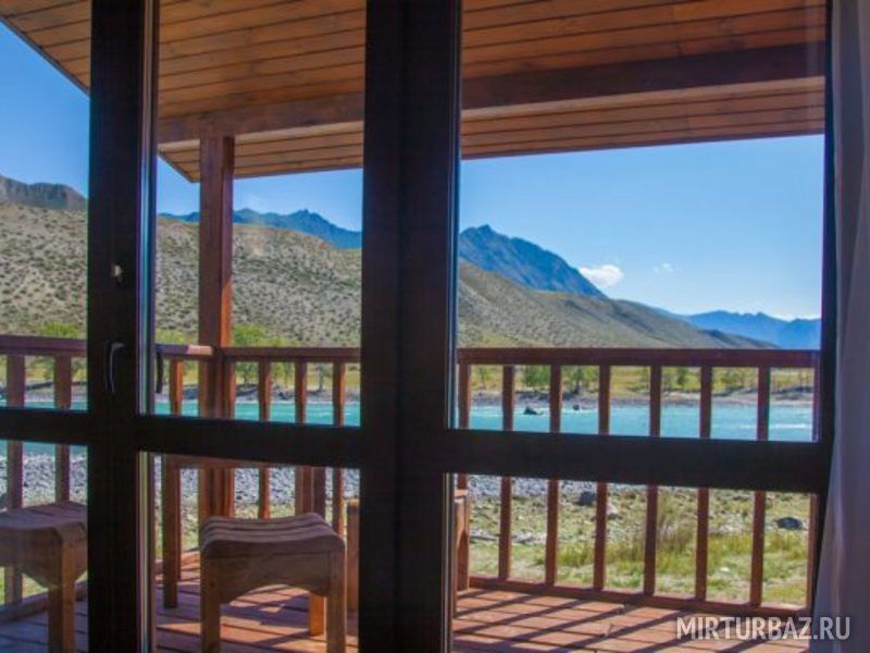 В номере: большая двуспальная кровать, односпальная кровать, прикроватные тумбы, чайник, чайный набор, стол, стулья, платяной шкаф, вешалки для одежды, обогреватель, большое панорамное окно до пола с видом на Катунь и долину, просторный балкон.