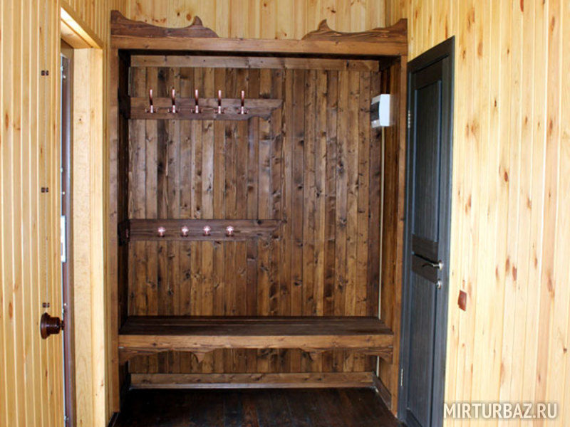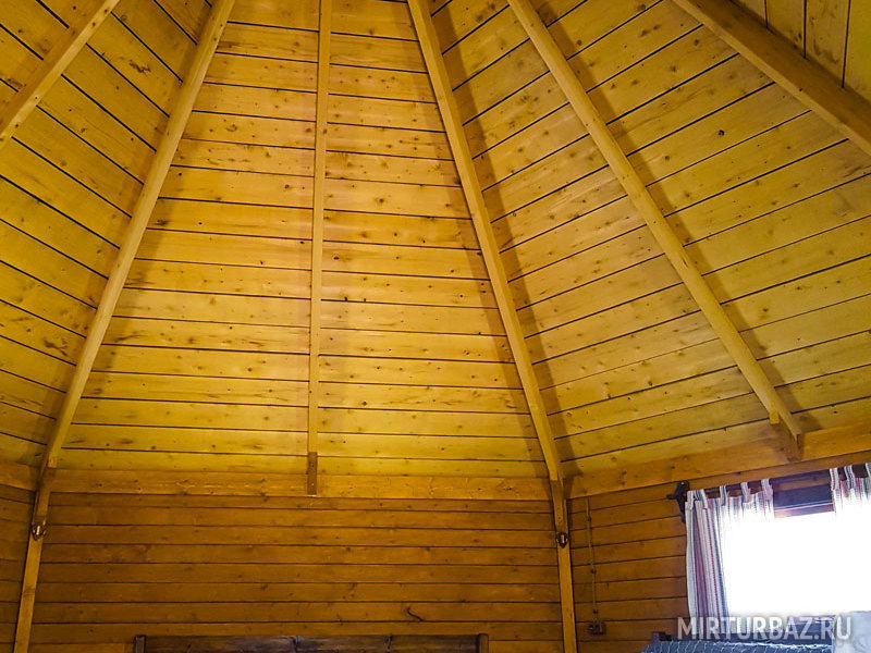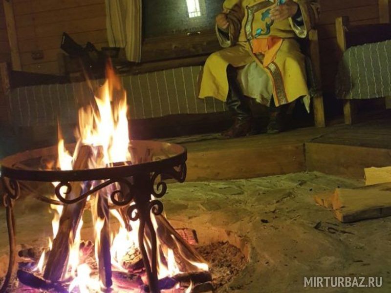 Четыре кровати обеденный стол, лавки, набор посуды, казан, чайник для приготовления пищи на костре, электричество (свет, розетки), умывальник.