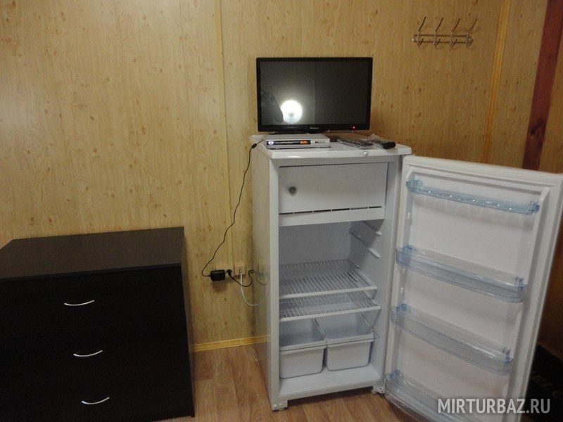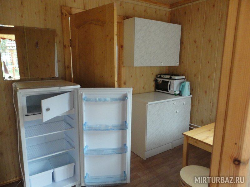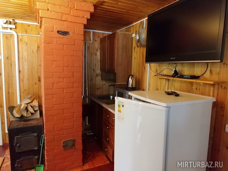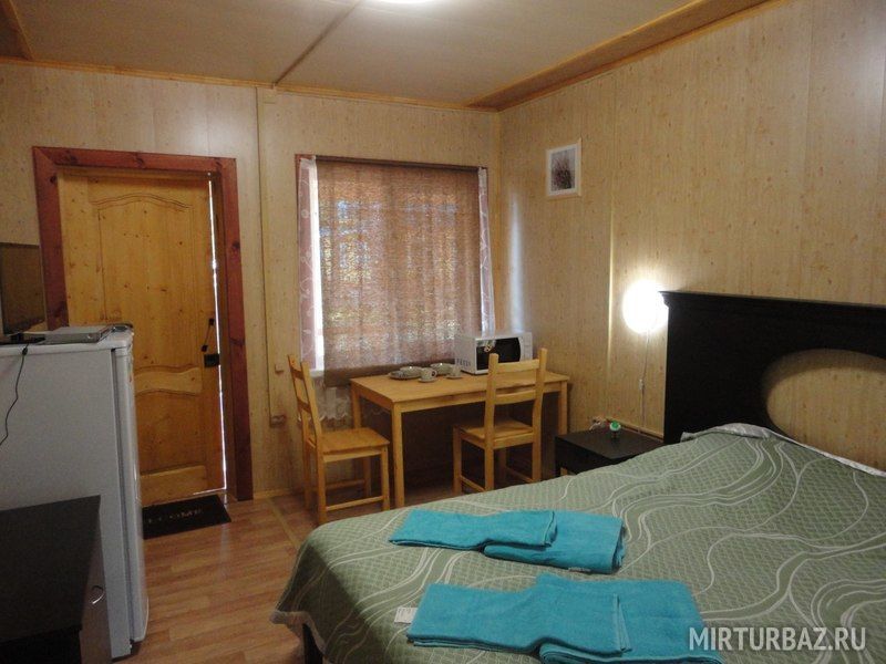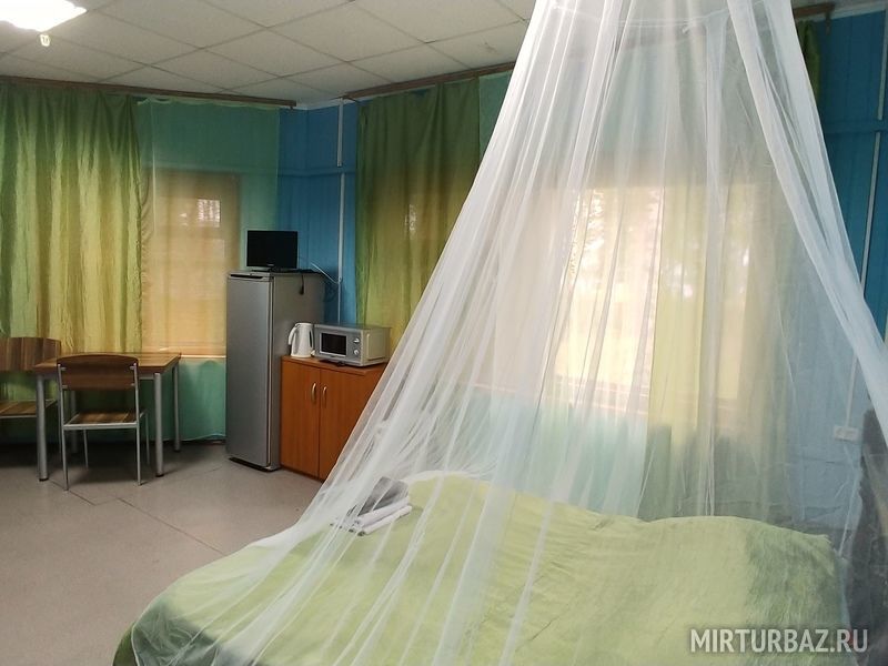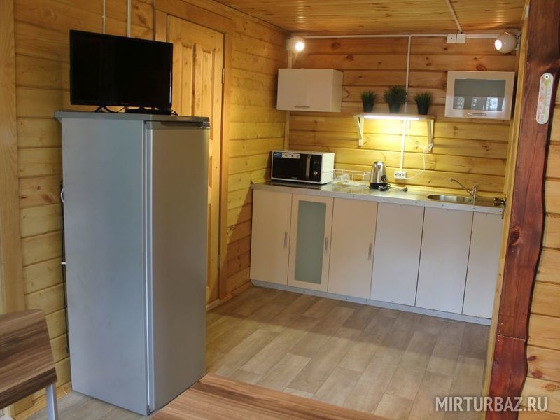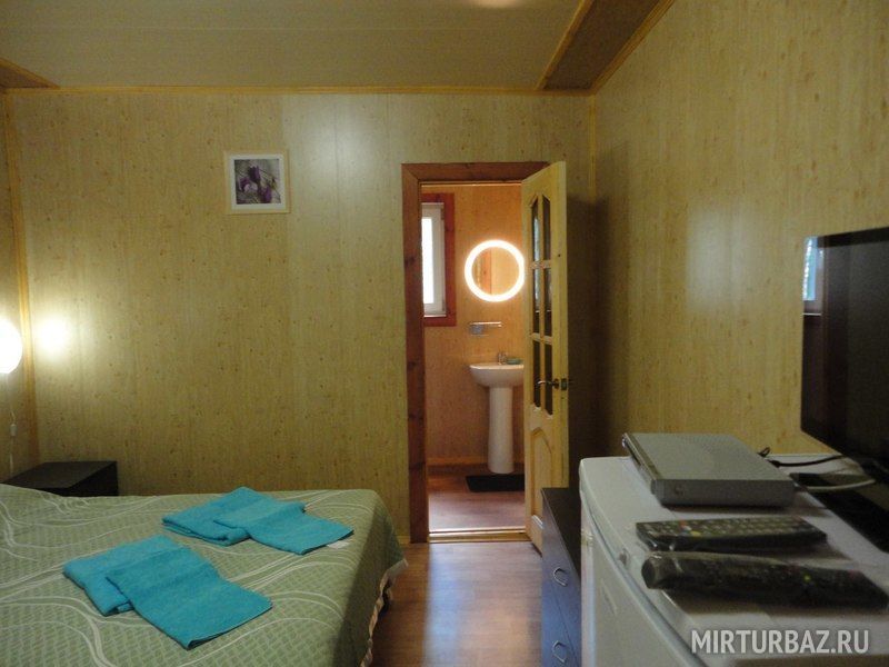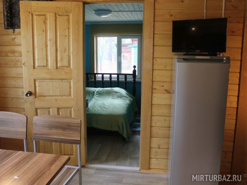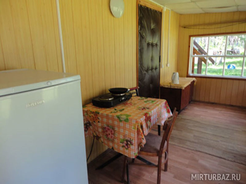 Предназначен для проживания в летнее время (без отопления). Можно поставить калорифер в случае низкой температуры на улице. Есть душ с холодной и горячей водой и санузел. Каждый номер укомплектован мебелью, кухонным гарнитуром, набором посуды, микроволновой печью, чайником. Имеется телевизор, по одному на два номера. Рядом с домом имеется гриль – аренда 1000 руб. в сутки.