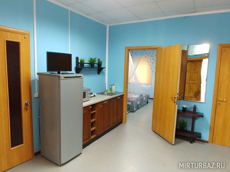 Есть душ с холодной и горячей водой. Каждый номер укомплектован мебелью, кухонным гарнитуром, набором посуды, микроволновой печью, чайником. Имеется телевизор, по одному на два номера (без интернета).