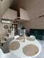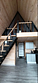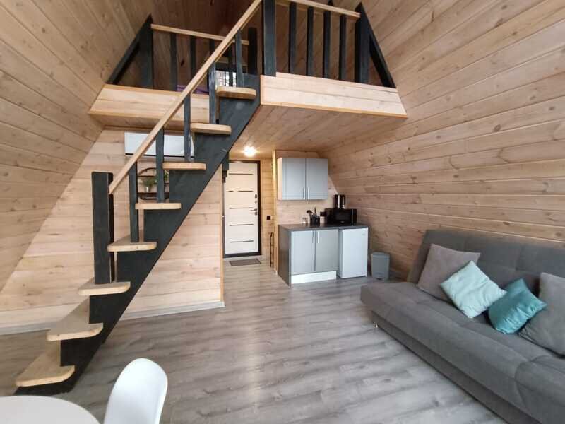На первом этаже дома расположена прихожая, оборудованная кухонная зона , уютная гостиная с панорамными окнами , ванная комната. На втором этаже находится большое двуспальное место .