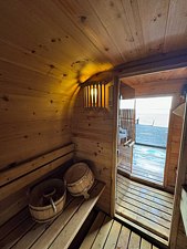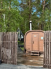 А на самом берегу расположилась баня-бочка с выходом к воде, где можно хорошенько расслабиться и насладиться окружающей природой.