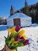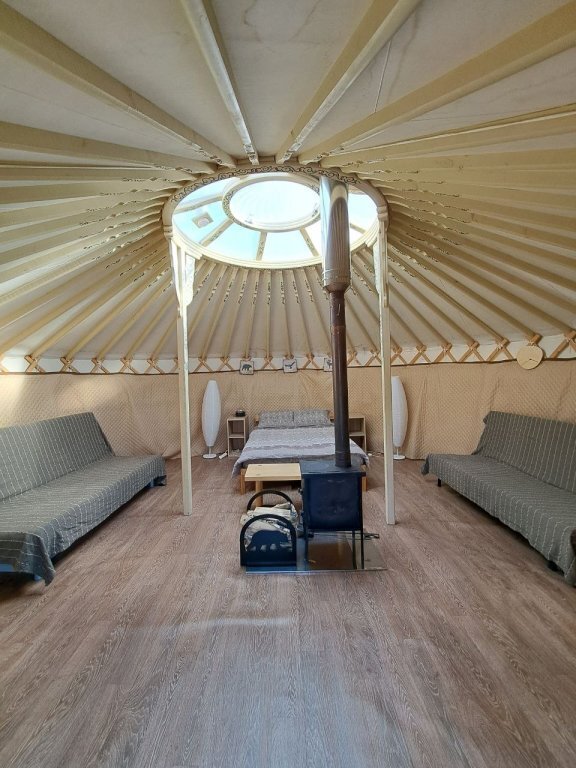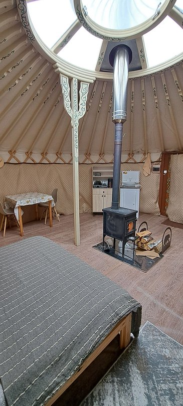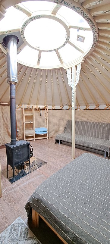 Максимальная вместимость до 8-ми человек Тепло в юрте поддерживается дровяной печью, а также электрическим тёплым полом. В юрте имеются напольные светильники и розетки 220в для зарядки ваших гаджетов. Есть полочки и столики для размещения ваших личных вещей. Уютная, светлая, просторная, тёплая юрта ждёт своих гостей.