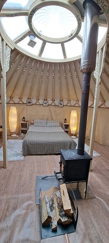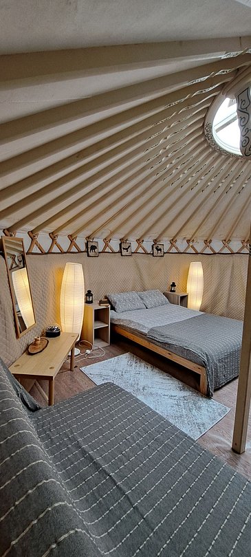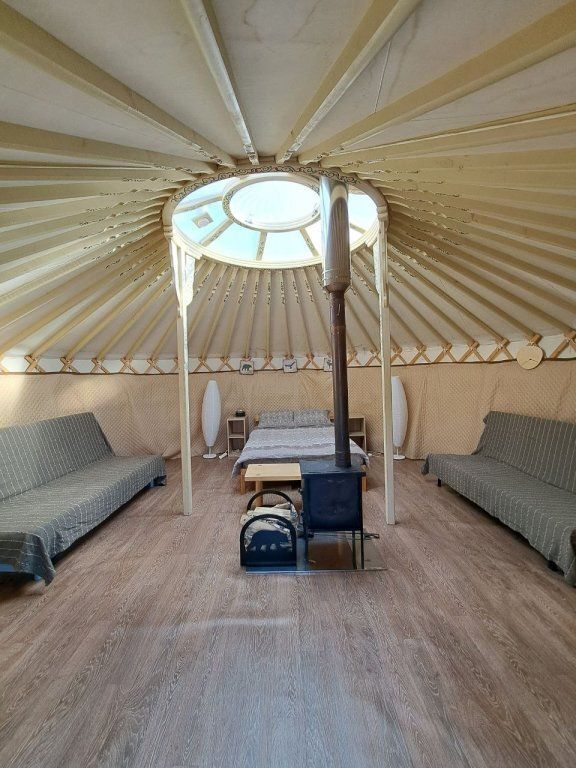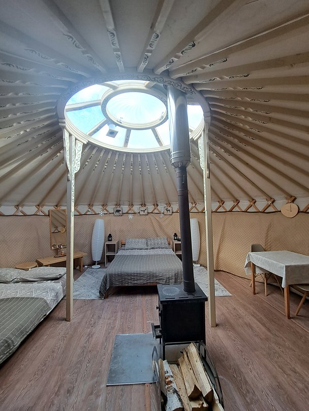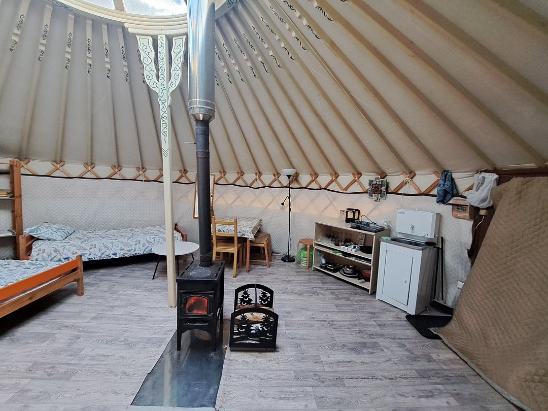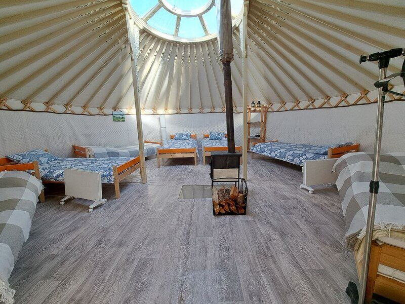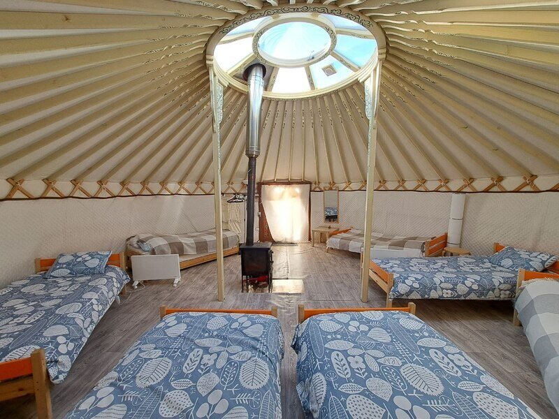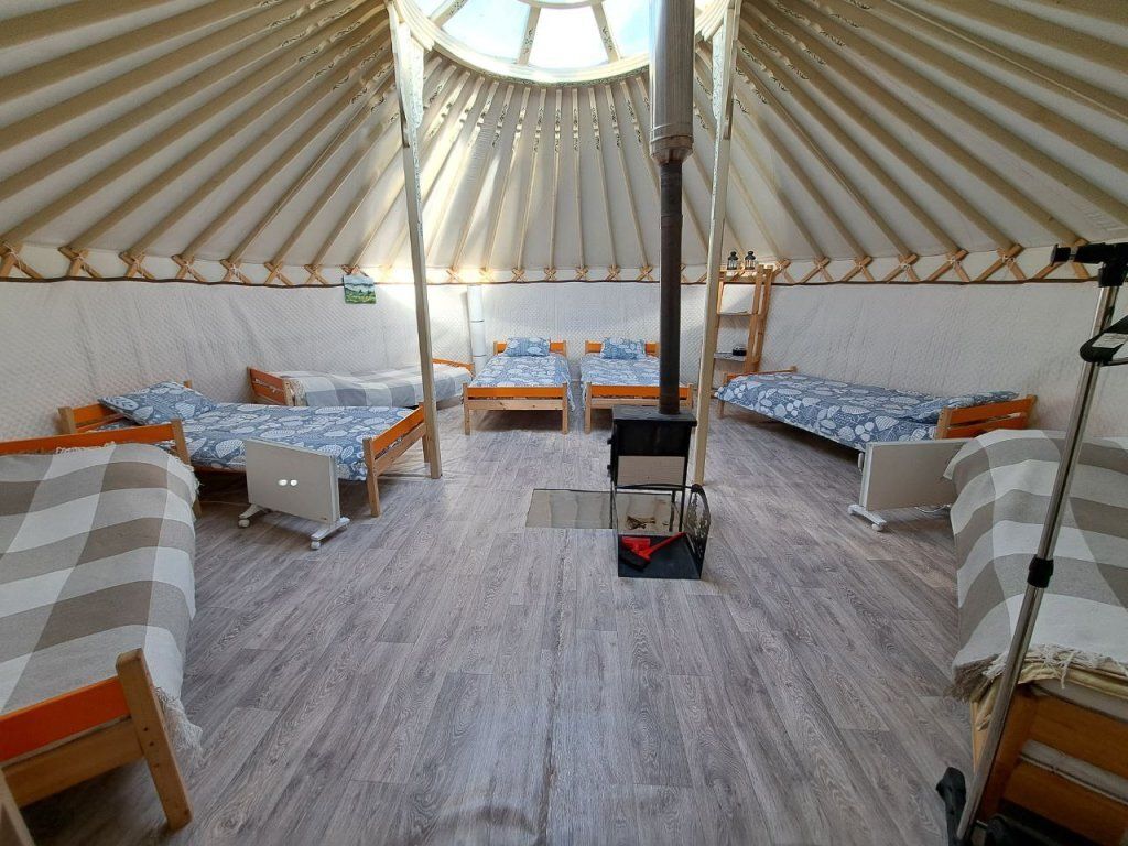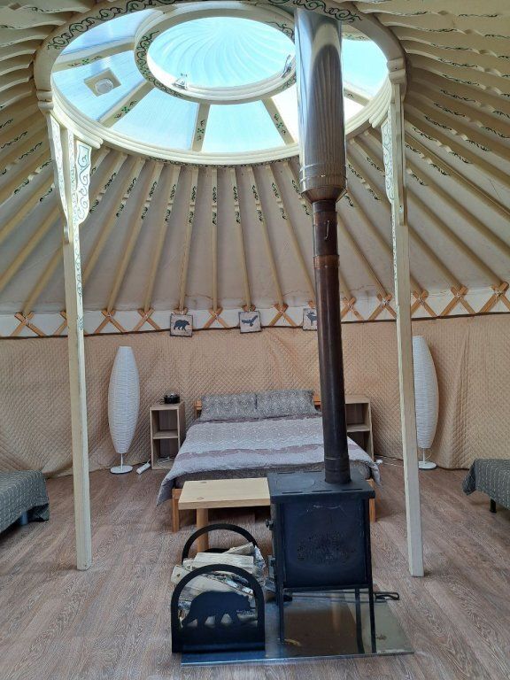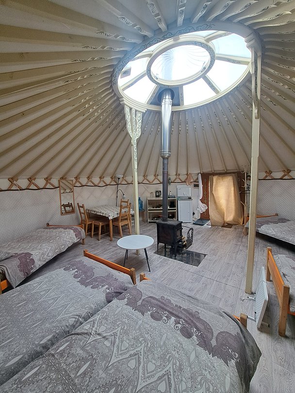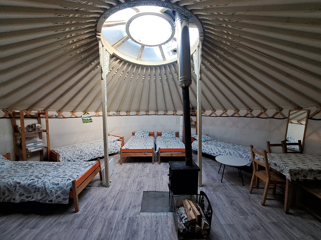 Юрта отлично подойдет для большой семьи или небольшой сборной группы так как в ней расположено шесть 1сп кроватей. Насладитесь необычной атмосфрой, игрой огня в печке и звездным небом которое видно через прозрачный купол юрты.