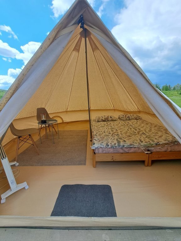 В шатре комфортные кровати, столик, стулья. Свет, розетки 220В. Для тепла электрообогреватель и простыни с электро-подогревом.