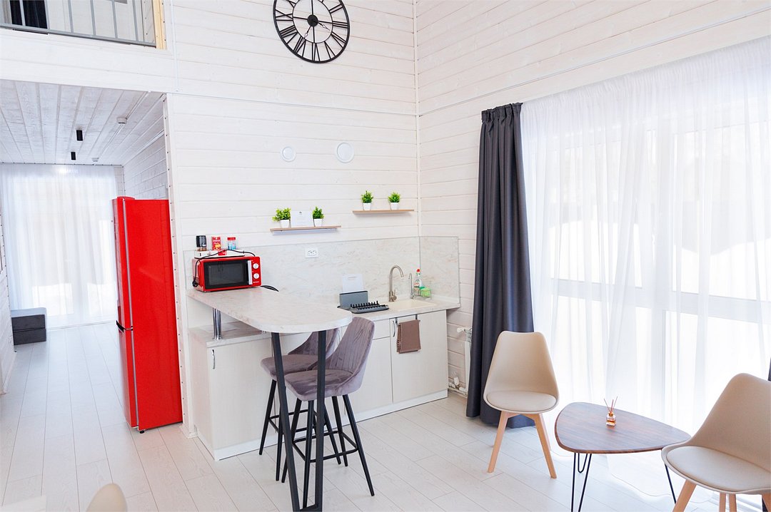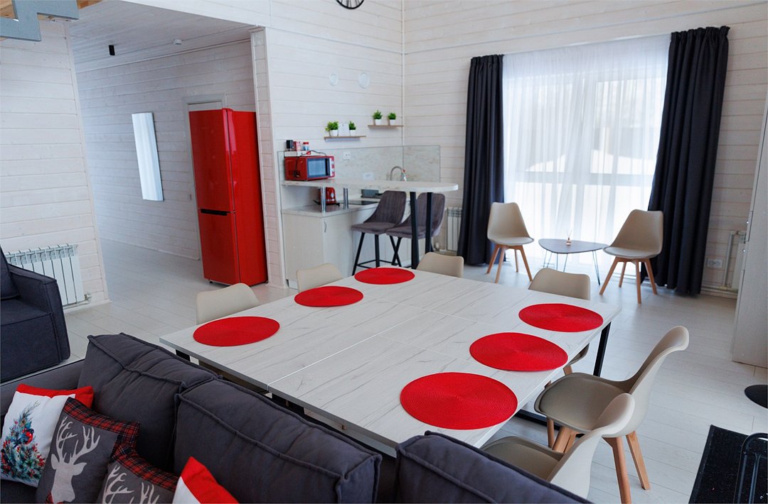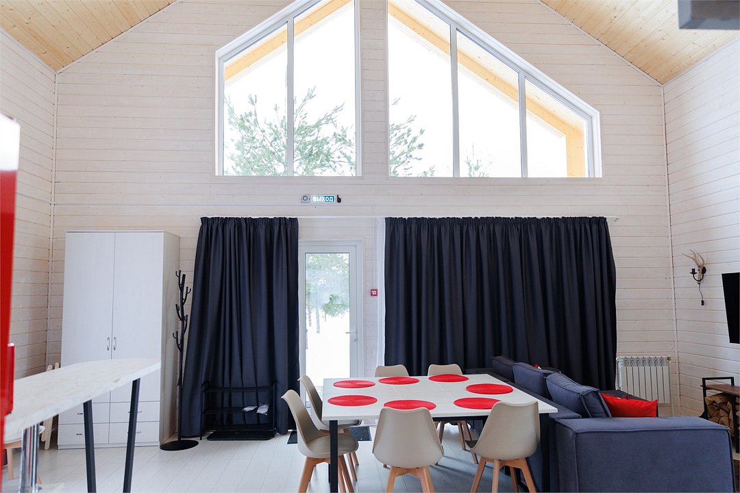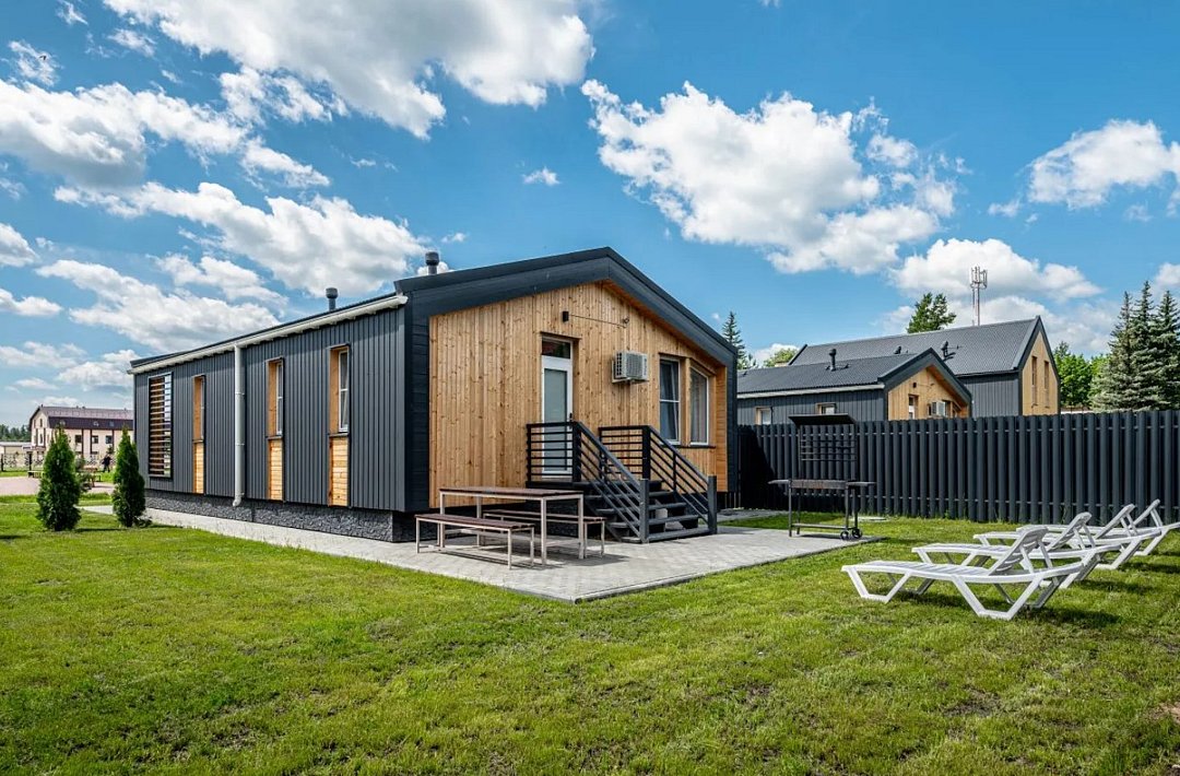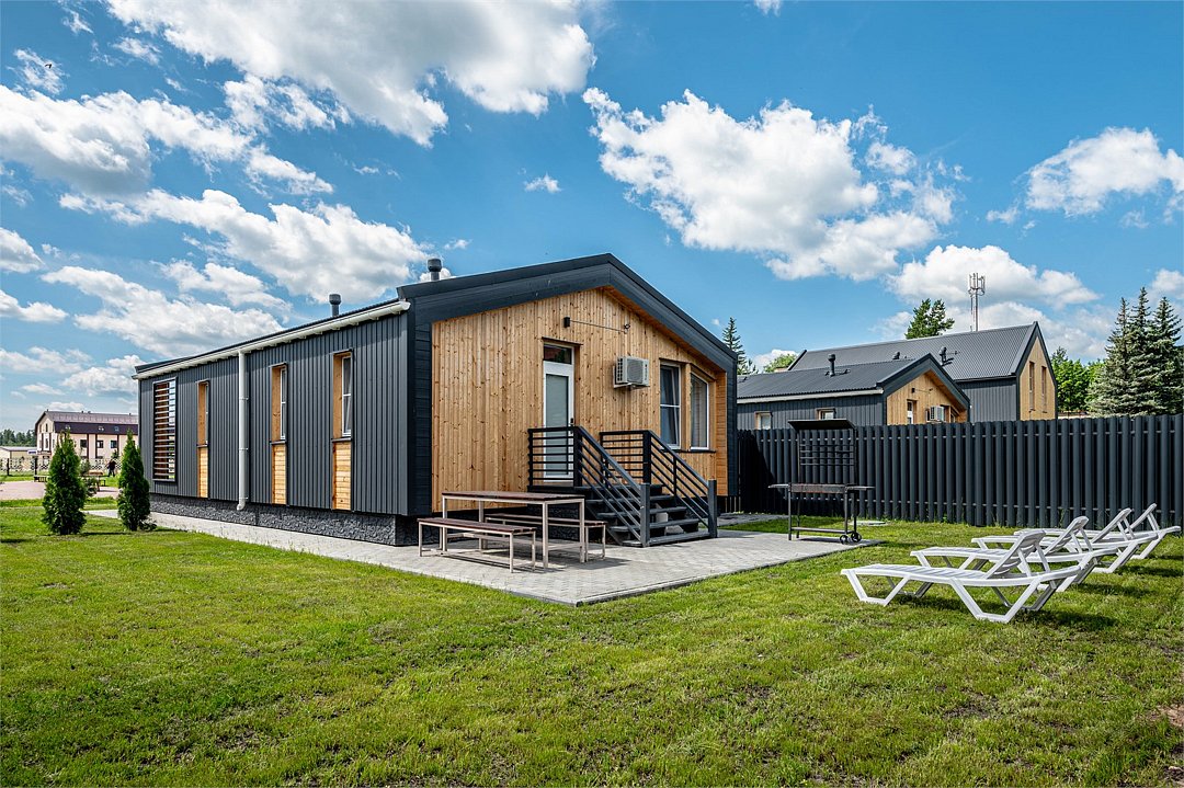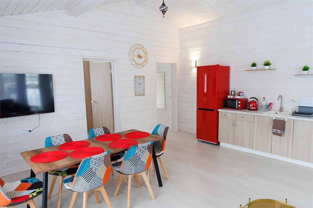 На улице — мангальная зона и столик для отдыха на свежем воздухе. Внутри — кухонный уголок с холодильником и раковиной, санузел, обеденные столы и диван для отдыха. Это идеальное место для семейных праздников и дней рождений, где можно выбрать один из четырех домов разного дизайна и цветовой гаммы для создания незабываемой атмосферы вечера.