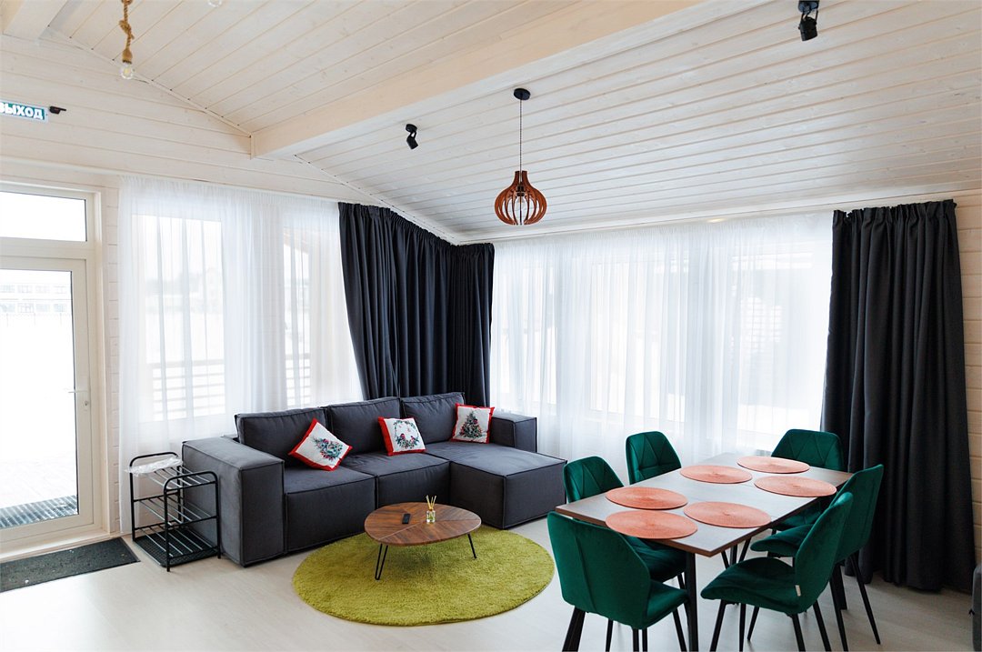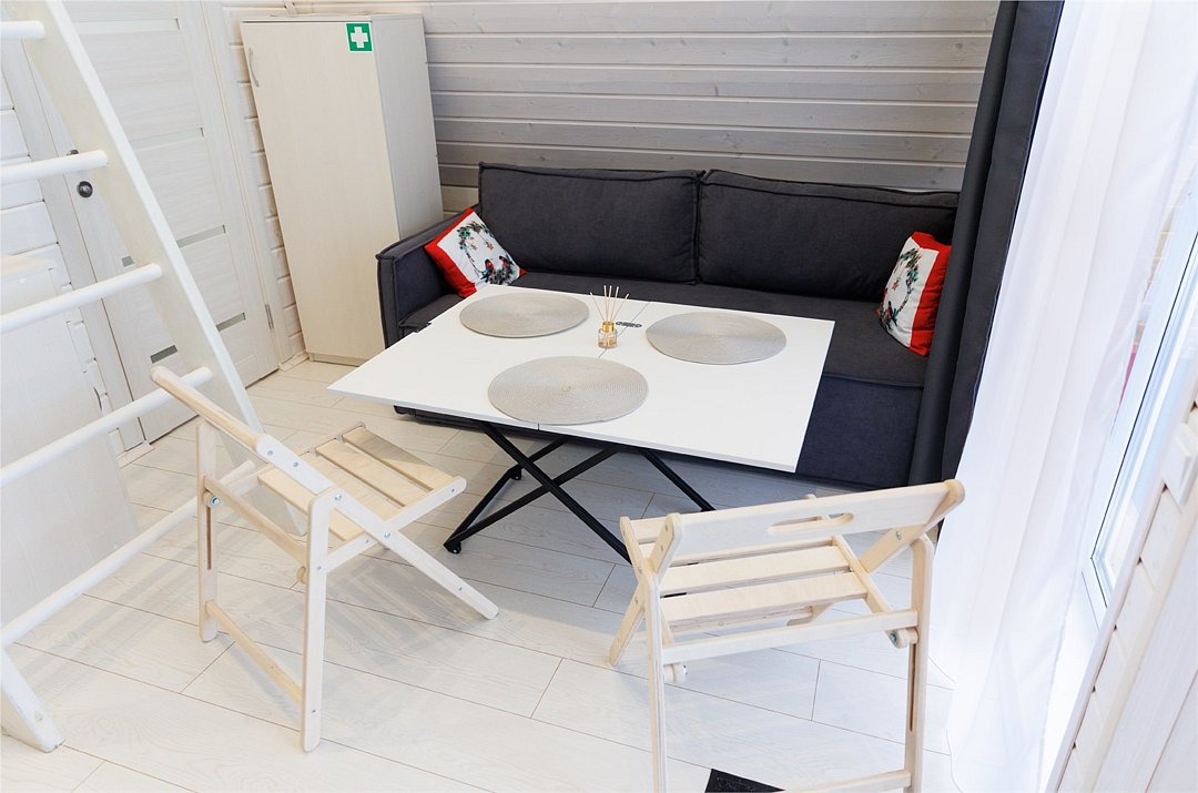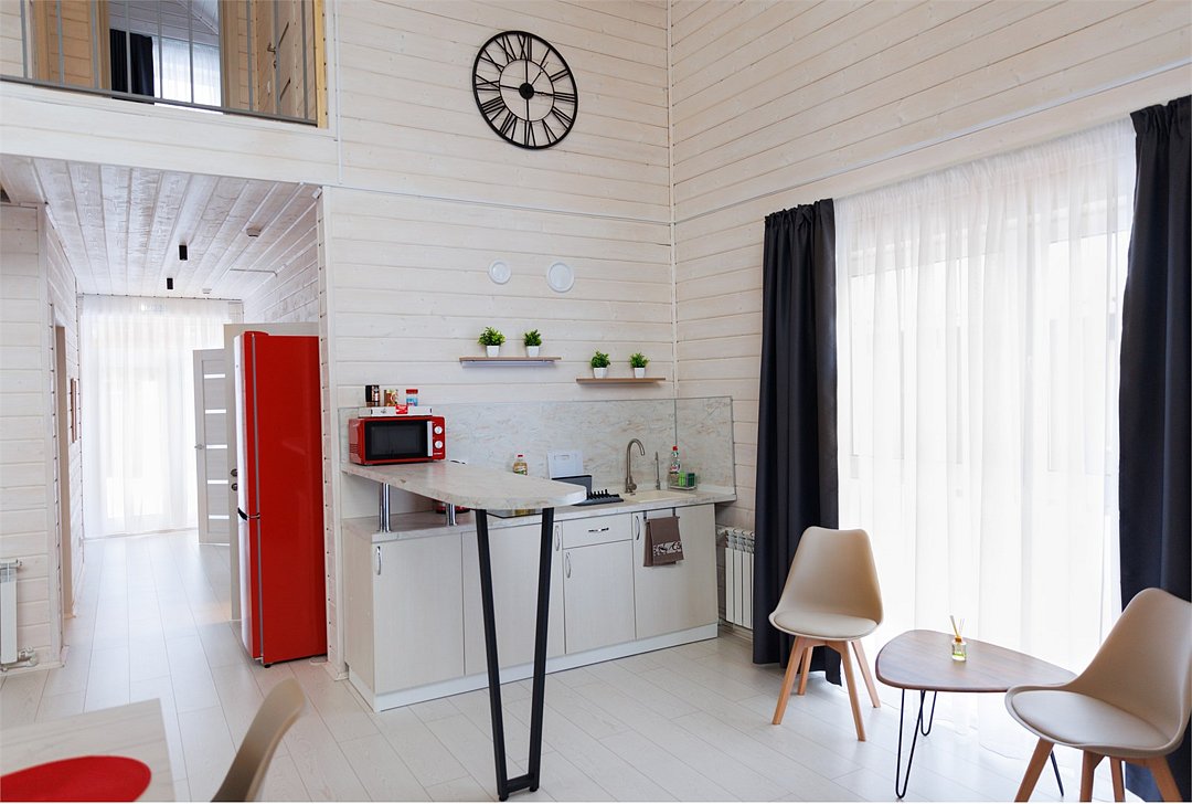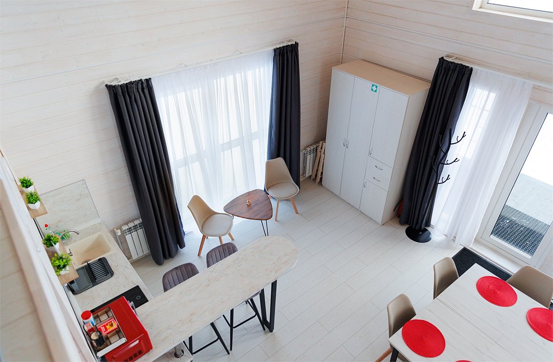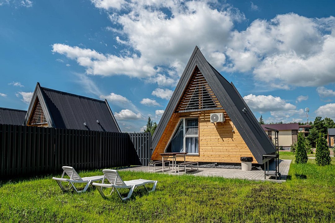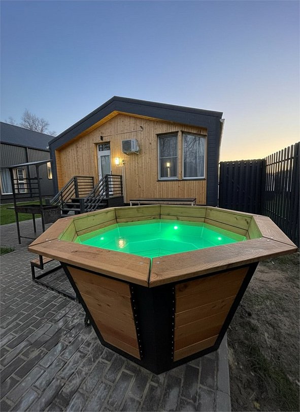На улице — мангальная зона и столик для отдыха на свежем воздухе. Внутри — кухонный уголок с холодильником и раковиной, санузел, обеденные столы и диван для отдыха. Это идеальное место для семейных праздников и дней рождений, где можно выбрать один из четырех домов разного дизайна и цветовой гаммы для создания незабываемой атмосферы вечера.