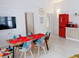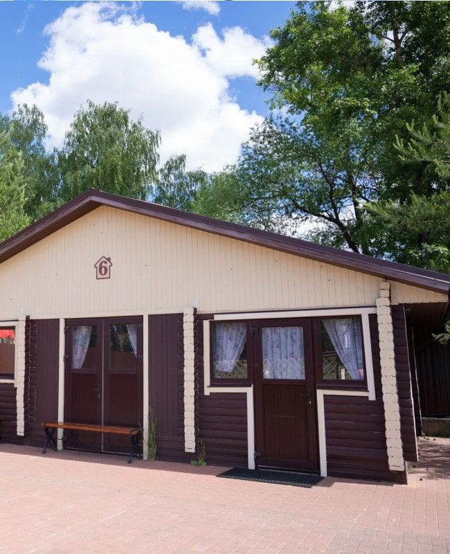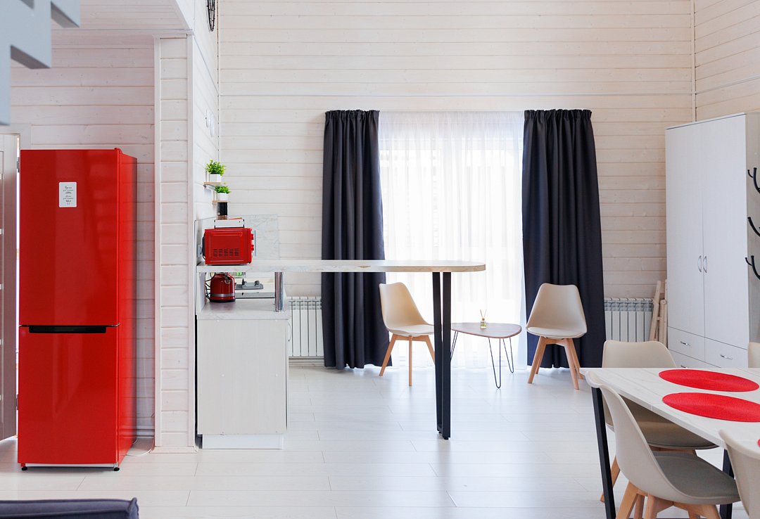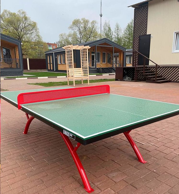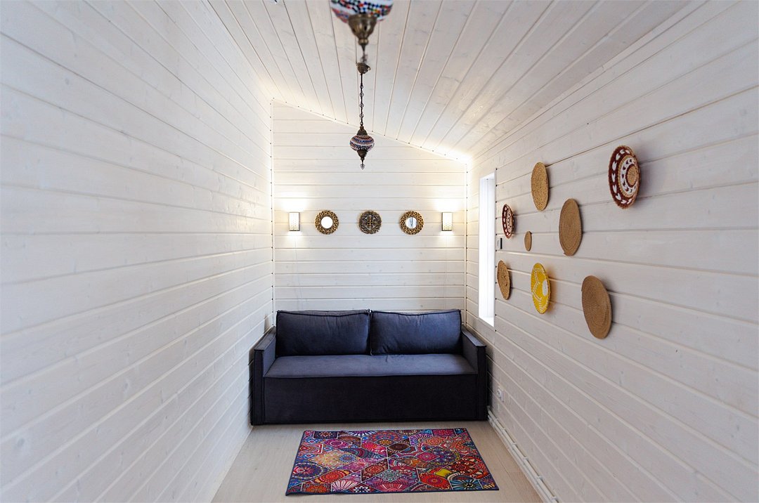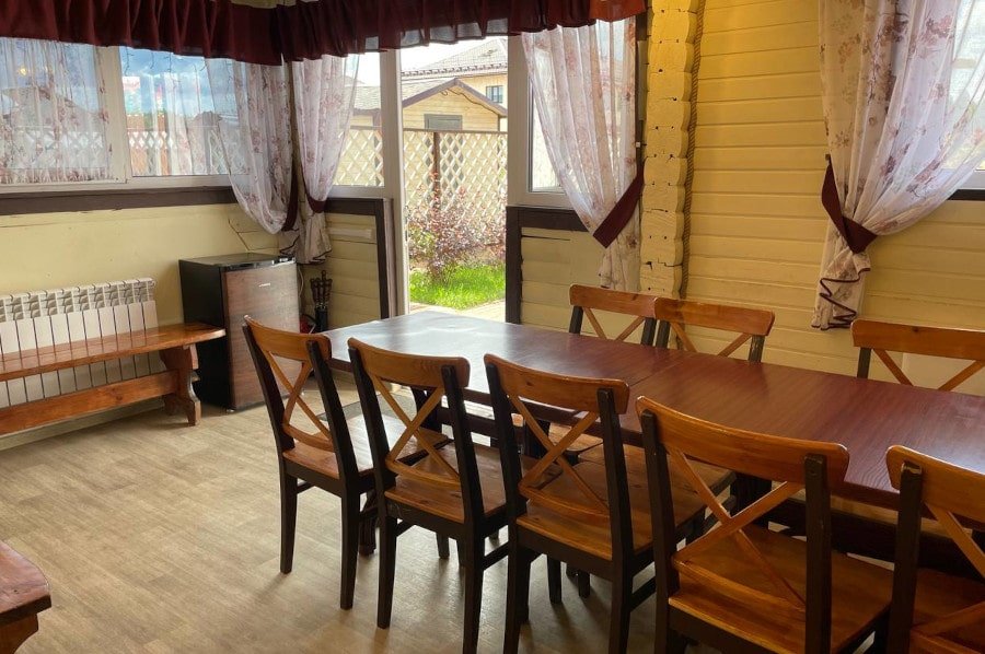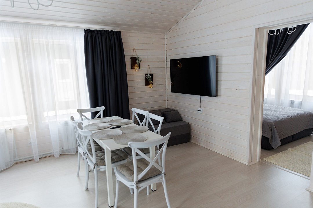 На улице — мангальная зона и столик для отдыха на свежем воздухе. Внутри — кухонный уголок с холодильником и раковиной, санузел, обеденные столы и диван для отдыха. Это идеальное место для семейных праздников и дней рождений, где можно выбрать один из четырех домов разного дизайна и цветовой гаммы для создания незабываемой атмосферы вечера.