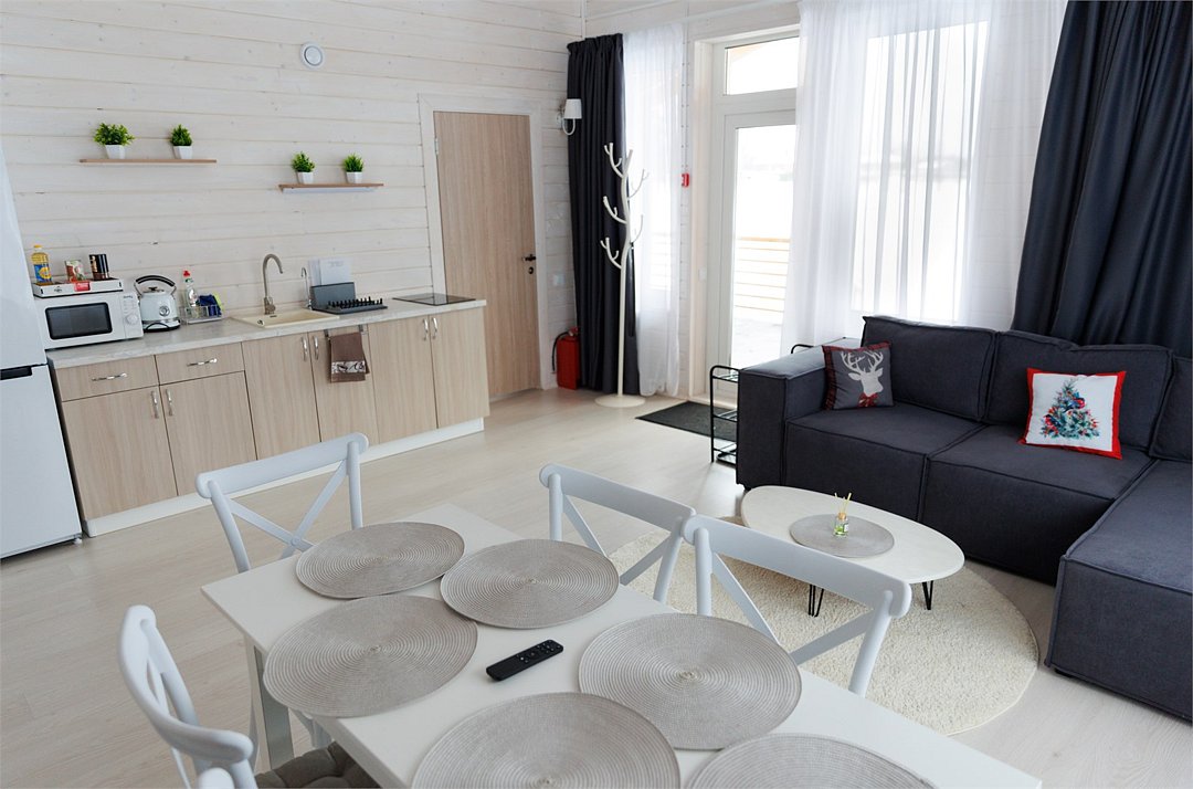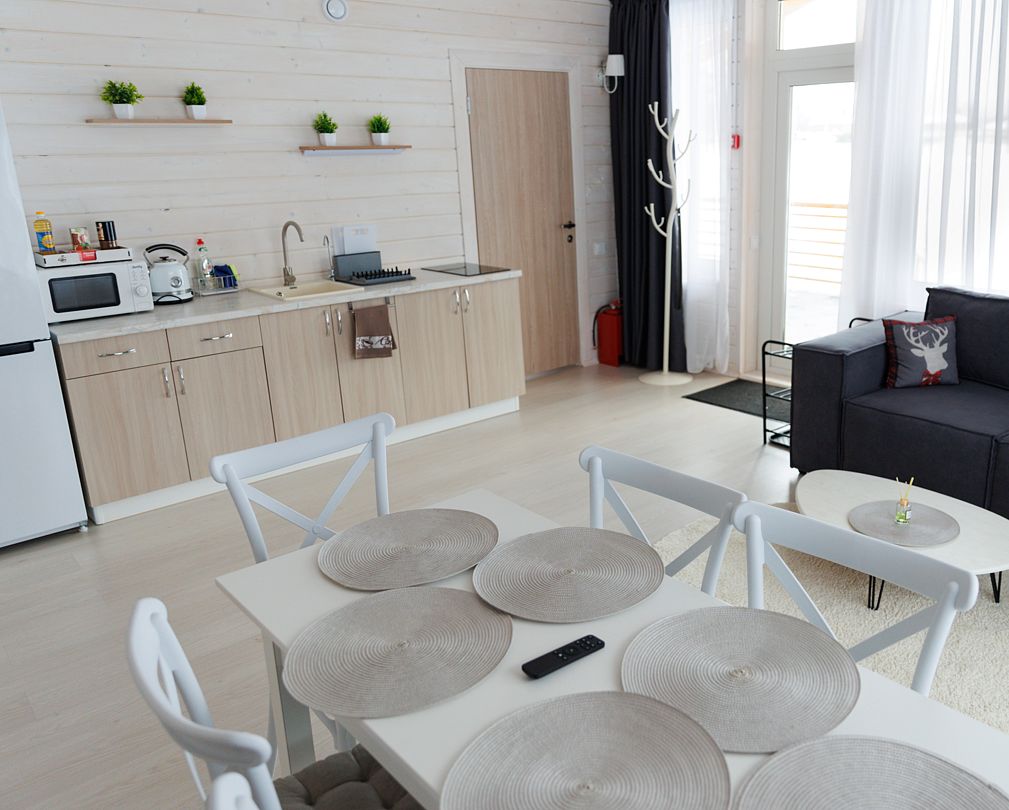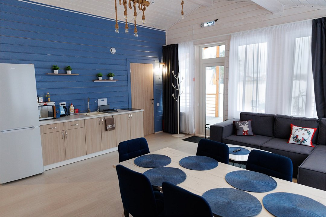 Домик оснащен двумя санузлами — один с душевой кабиной, другой с ванной, а также полноценной кухней с плитой, чайником, микроволновкой и холодильником, а также всей необходимой посудой и барной стойкой. Для Вашего комфорта в каждом доме предусмотрено централизованное отопление и кондиционер.