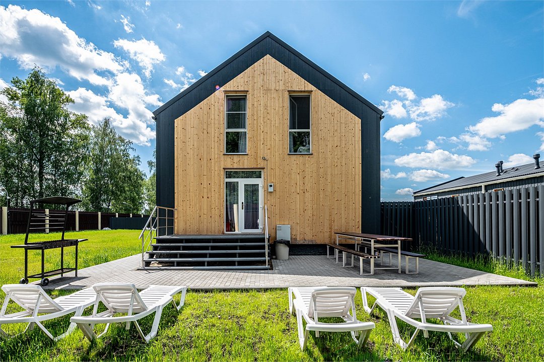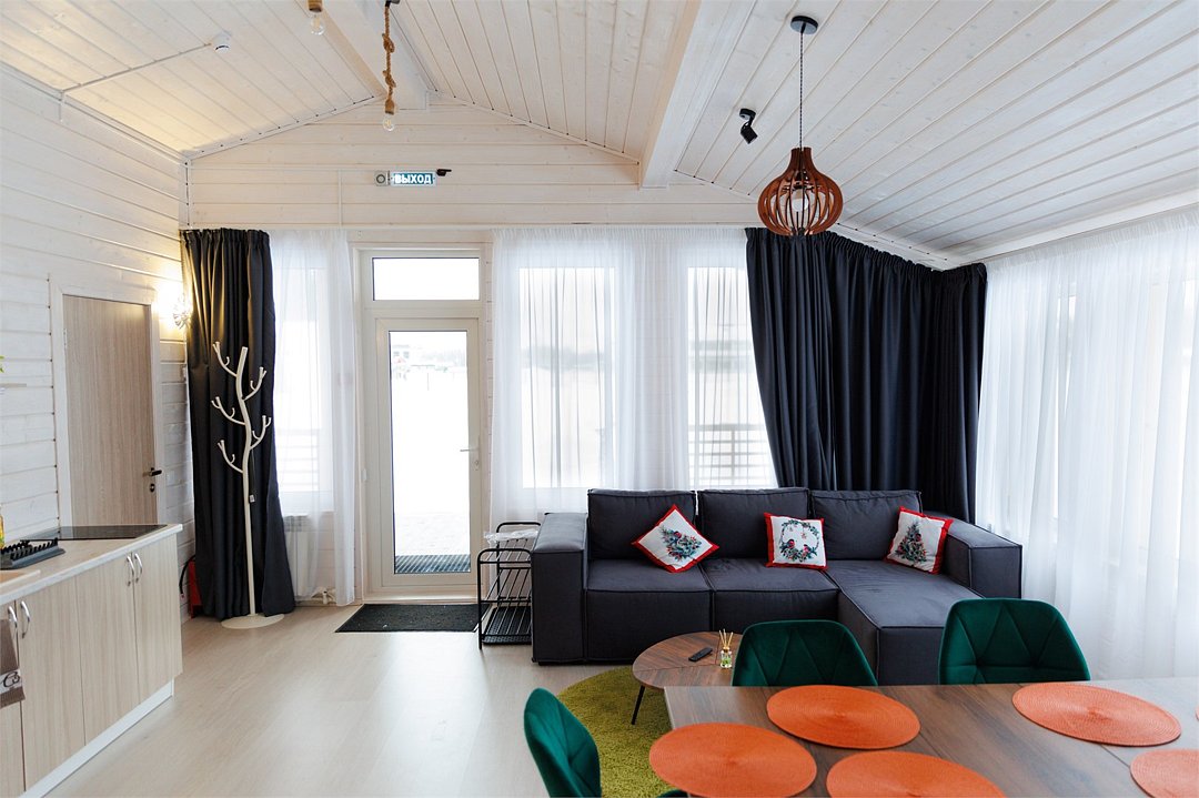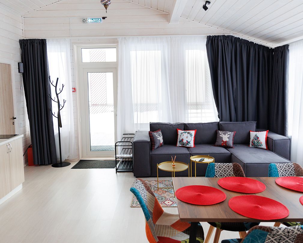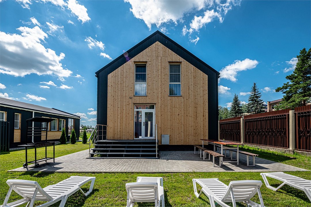 Площадь домика восемьдесят восемь квадратных метров, максимально комфортно позволяет разместить шесть человек. Максимально возможное заселение семь–восемь человек, в зависимости от выбранного дома.