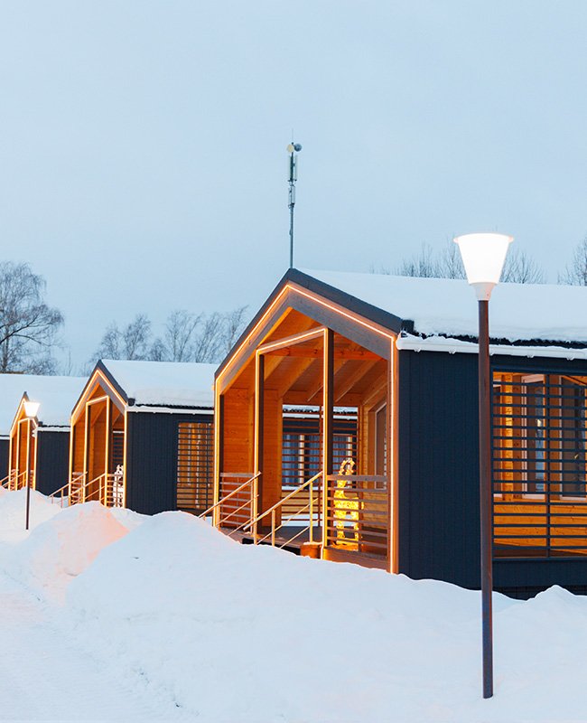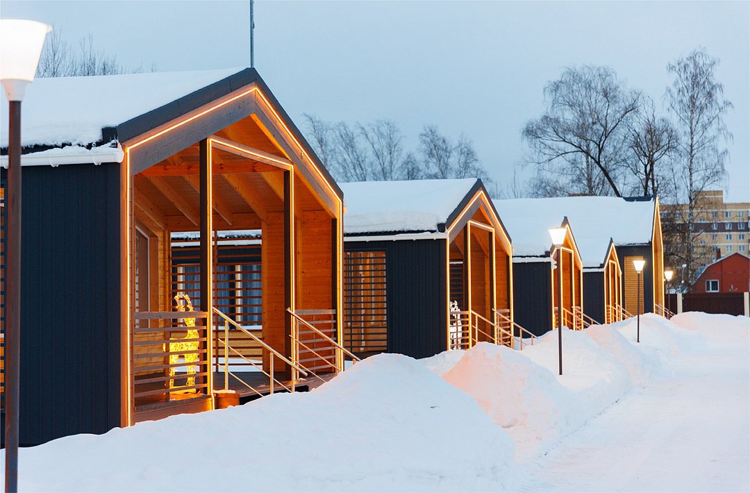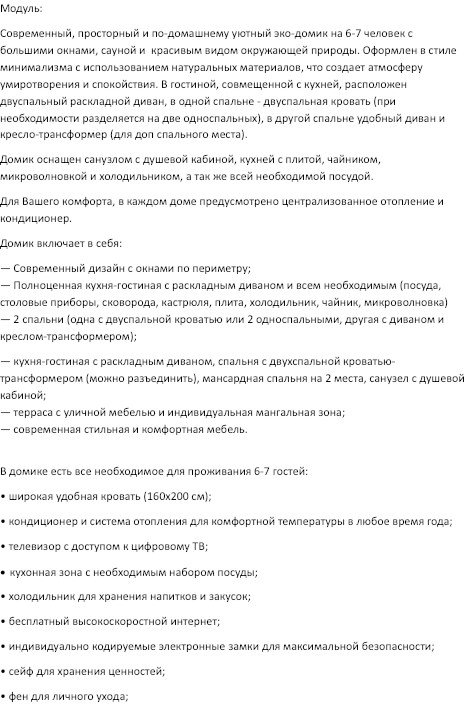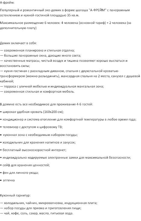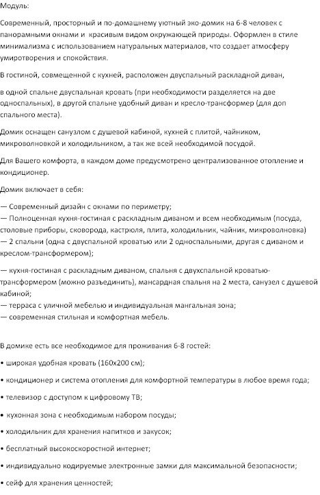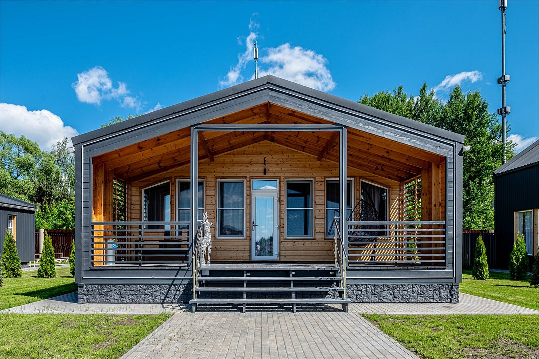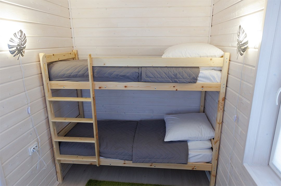 Площадь домика восемьдесят восемь квадратных метров, максимально комфортно позволяет разместить шесть человек. Максимально возможное заселение семь–восемь человек, в зависимости от выбранного дома.