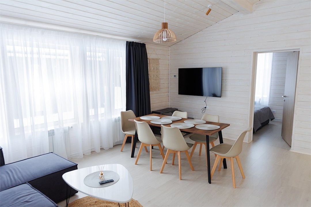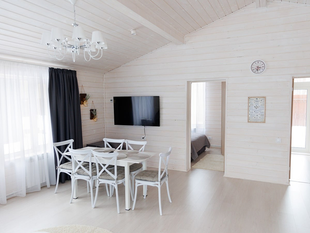 Площадь домика составляет восемьдесят восемь квадратных метров, что позволяет максимально комфортно разместить до шести человек. Максимально возможное заселение — до семи–восьми человек, в зависимости от выбранного варианта.