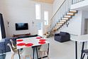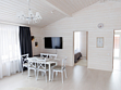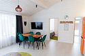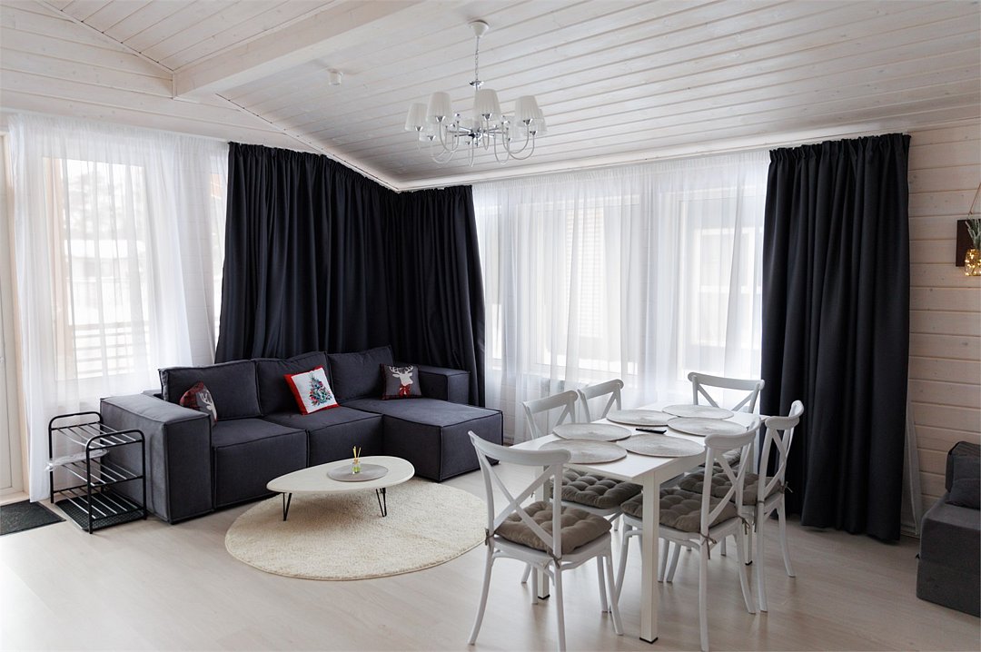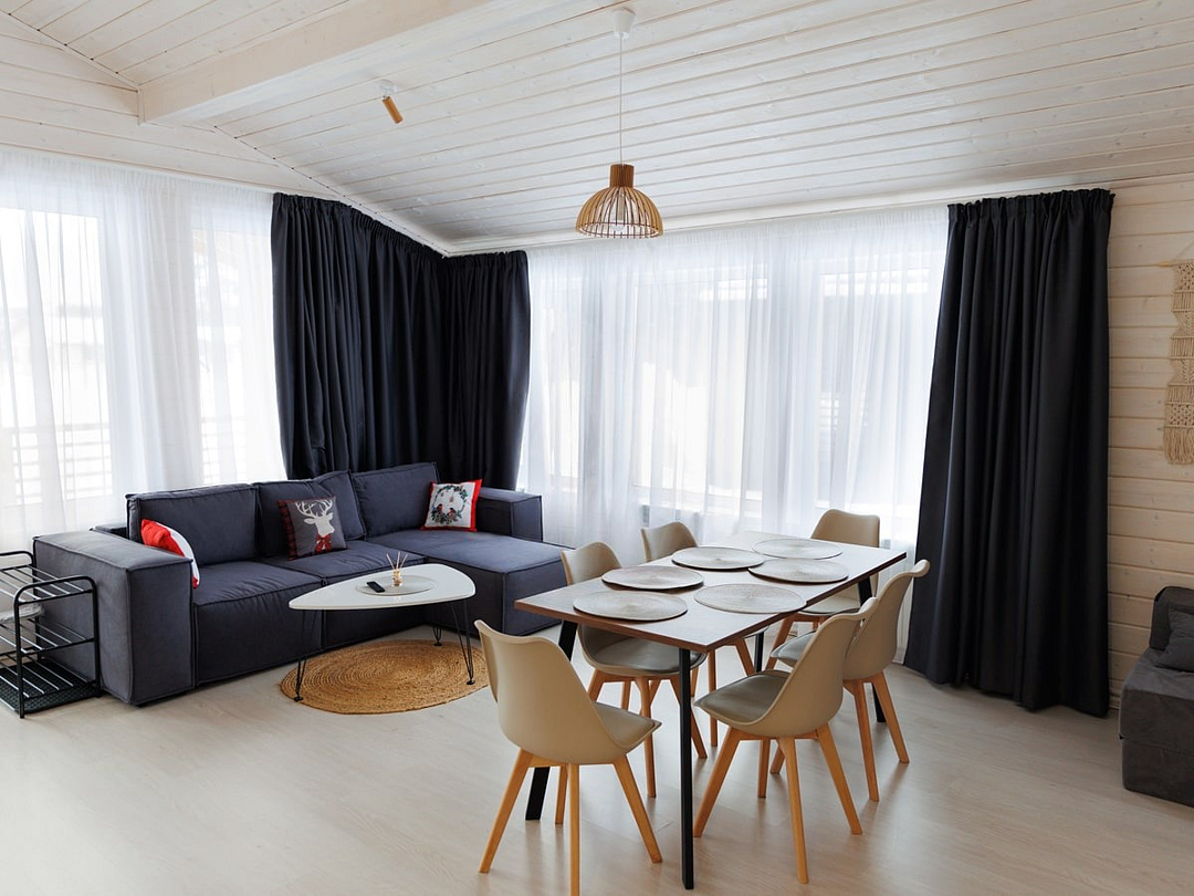 В гостиной, совмещенной с кухней, расположен удобный раскладной диван, который при необходимости позволяет разместить еще двух гостей. Спальные зоны расположены на мансарде и в отдельной комнате на первом этаже.