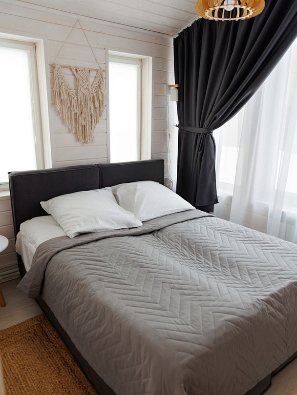 В спальнях две односпальные кровати или одна двуспальная. Для Вашего удобства, Вы можете дополнительно заказать завтрак в номер, тапочки, халаты, зубной набор, бритвенные принадлежности, чай, кофе, сахар, а также решетки и шампура.