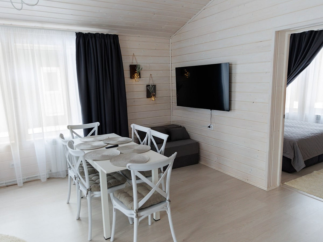 Романтичный эко-домик с панорамными окнами, верандой и мангальной зоной. 35 м² уюта, где всё продумано для отдыха пары, семьи или компании до 6 человек. 4 человека (основной тариф) + 2 человека (за дополнительную плату). В доме: кухня-гостиная, спальня, посуда, кондиционер, отопление. Мангал и шампуры — бесплатно Можно с питомцем до 3,5 кг за дополнительную плату (лежанка, миска, лоток). Дети до 3 лет — бесплатно без предоставления места. Дополнительно: завтрак — 700 ₽, бассейн — 800 ₽/час, фитнес — 500 ₽. Цены и свободные даты — в календаре бронирования. Заезд с 15:00, выезд до 12:00 Мы уверены, что пребывание у нас станет незабываемым временем для всей вашей семьи и ваших друзей!Услуги и удобства