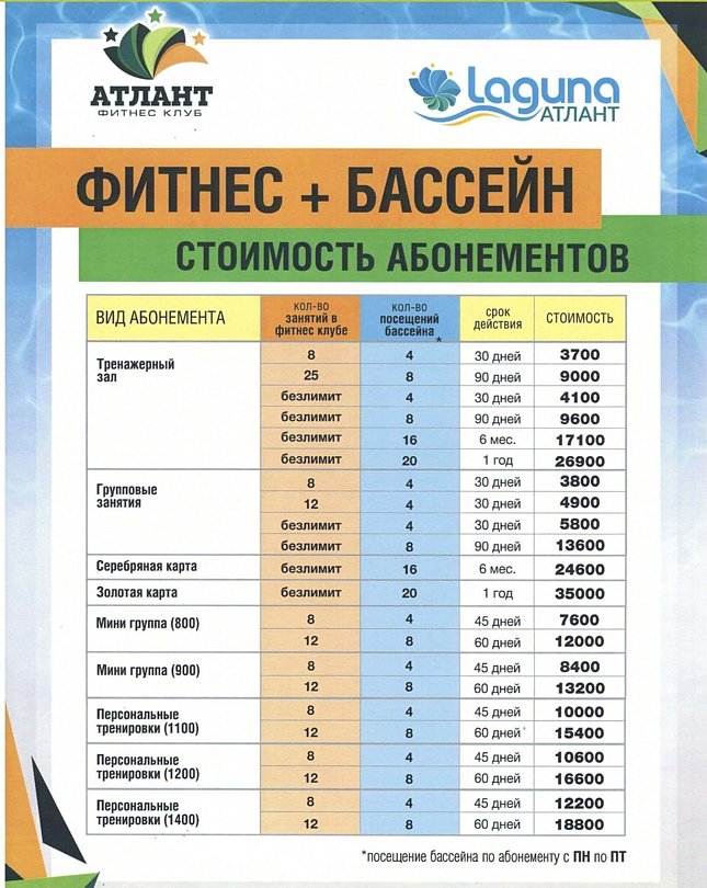 Фитнес-клуб «Атлант» — современное пространство, полностью оснащенное новейшим оборудованием. Здесь каждый найдет занятие по душе: от детского фитнеса и каратэ до йоги, пилатеса и танцев.