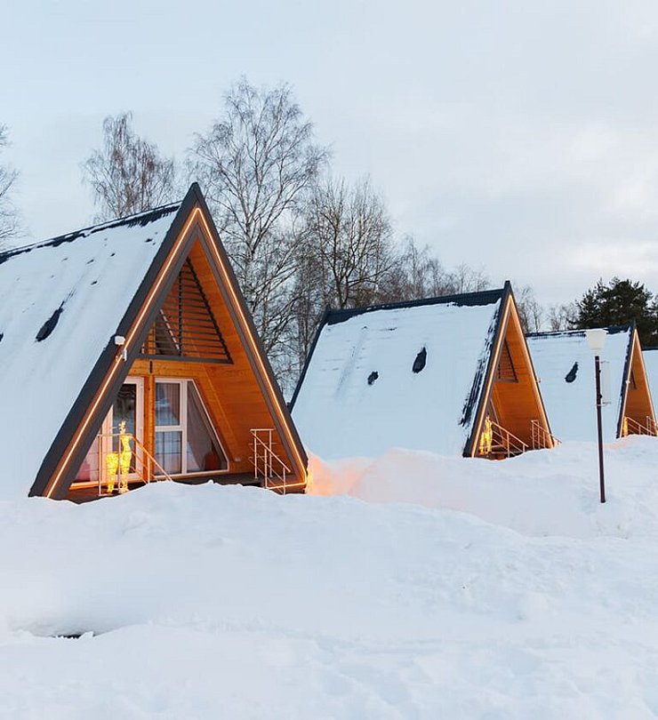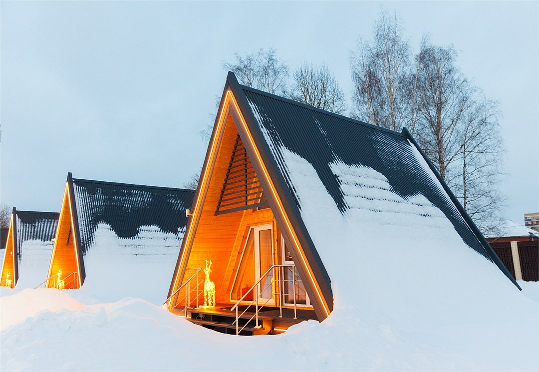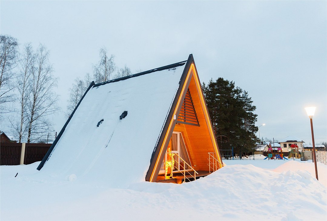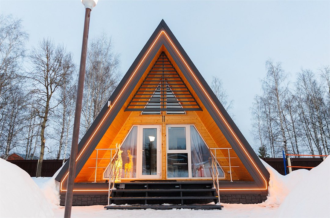 Уютный домик в стиле А-ФРЕЙМ с панорамным остеклением максимально комфортно позволяет разместить до четырех человек. Максимально возможное заселение — до шести человек.