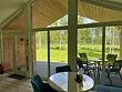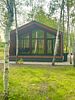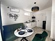 В домике есть отдельная спальня с двухместной кроватью, санузел с душевой кабиной, кухня-гостиная с панорамным окном и раскладным диваном. Интерьер выполнен в белых и зеленых тонах.