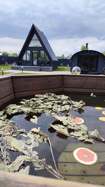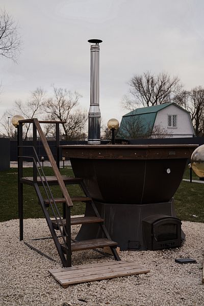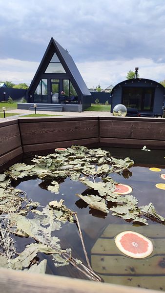 На территории установлена зона патио с мангалом и костровой чашей, алтайский чан и русская баня на дровах.