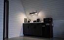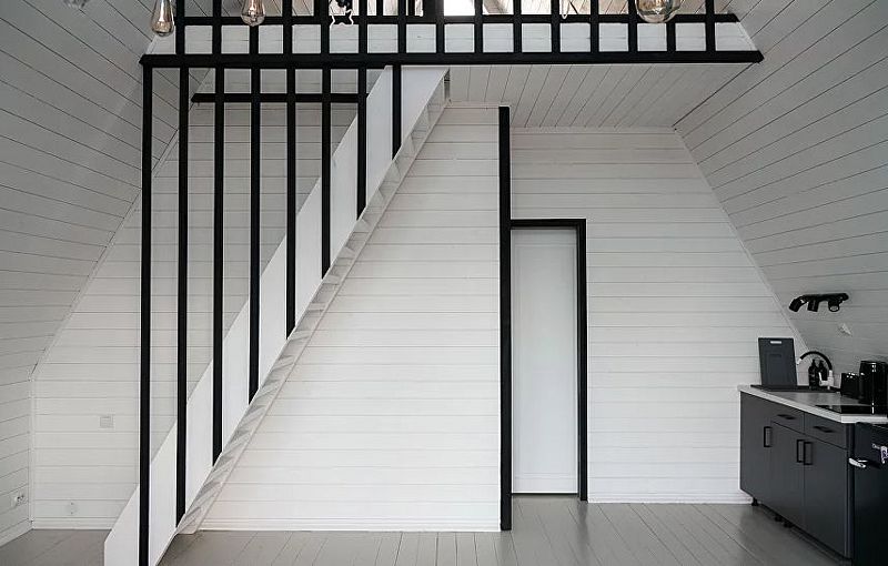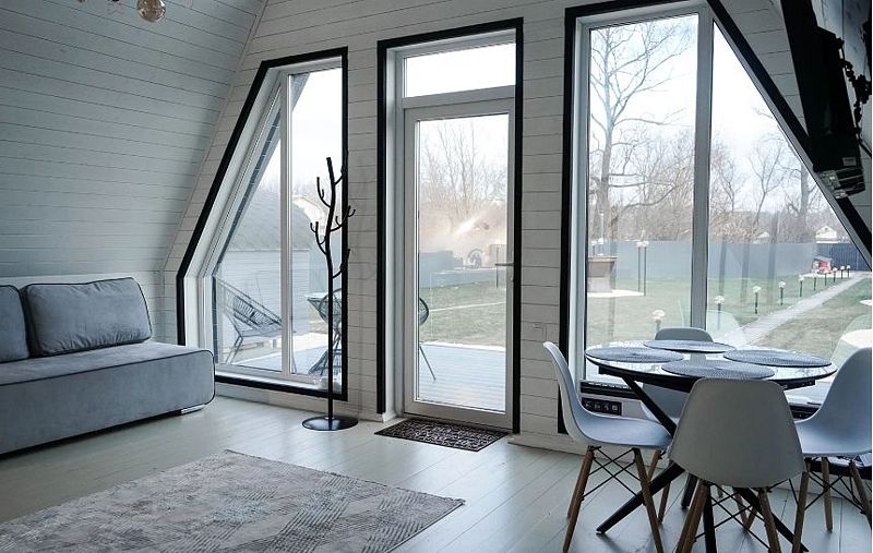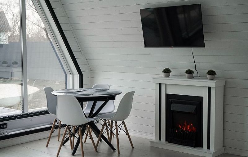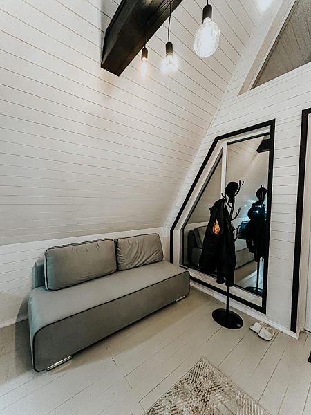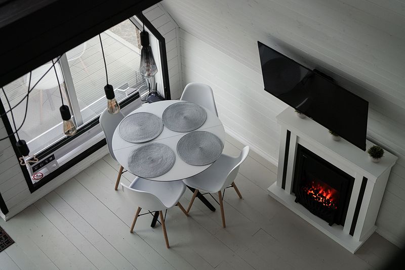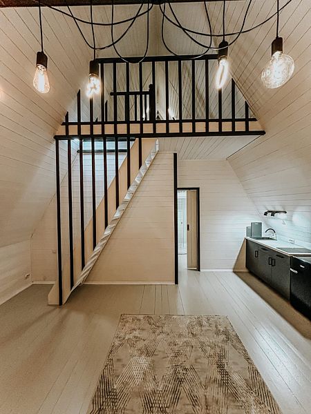 Планировкой предусмотрена просторная кухня-гостиная со вторым светом и электрокамином. На первом этаже есть отдельная спальня, на втором уровне дополнительное спальное место с большой кроватью.
