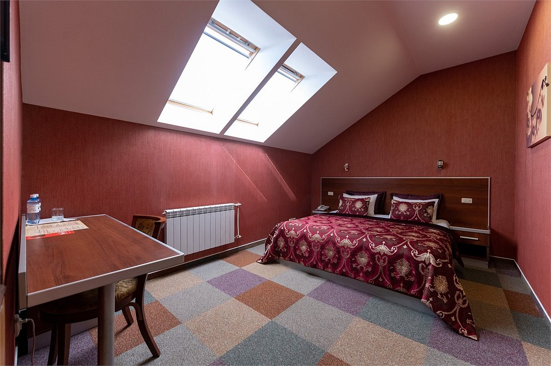 Номера категории «Стандарт мансарда» расположены на верхнем этаже отеля. Мансардные номера уникальны своей атмосферой, ведь в них есть все самое необходимое для комфортного проживания. Каждый номер категории «Эконом» оснащен двумя отдельными кроватями с прикроватными тумбами, телевизором, сплит-системой,холодильником. В комнате есть рабочий стол с телефоном, также есть выход в интернет. Современные санузлы оснащены ванной, феном, большим зеркалом. Бесплатная парковка под видеонаблюдением и служба Room Service 24ч.Услуги и удобства