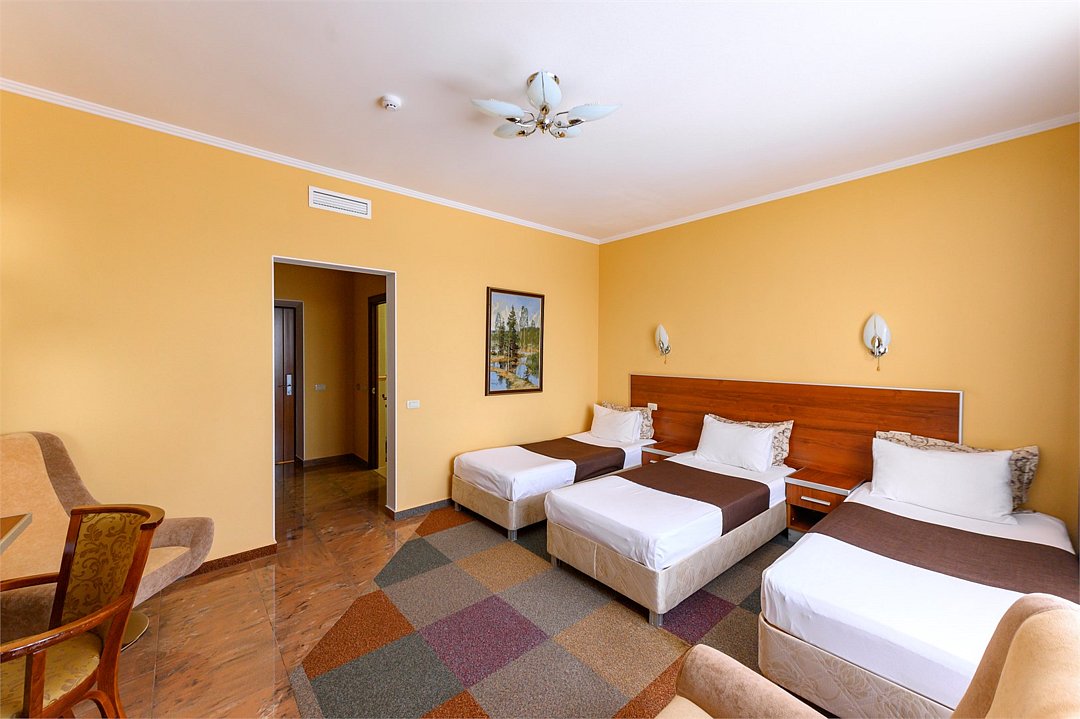 Уютный номер категории «Семейный» для размещения семейных пар с детьми. Двухкомнатный номер оборудован большой кроватью с прикроватными тумбами, двумя односпальными кроватями, большим мягким диваном, телевизором, сплит-системой, холодильником, чайной станцией, эргономичными креслами. При входе в номер расположен вместительный шкаф-купе. Просторный санузел оснащен ванной, феном, большим зеркалом, набором средств гигиены, мягкими халатами, тапочками, и полотенцами. В комнате есть поверхность для организации рабочего места. К услугам гостей предоставляется бесплатная парковка под видеонаблюдением.Услуги и удобства