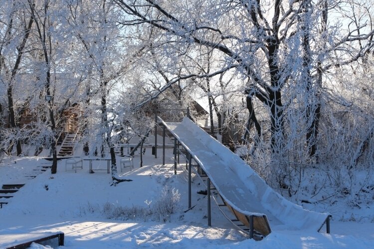 Летом деревья создают здесь приятную тень, а зимой, когда нет листвы, площадку озаряет яркое солнце.