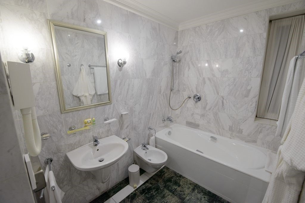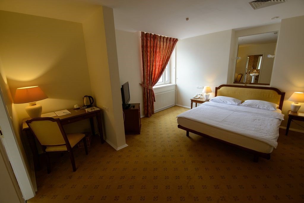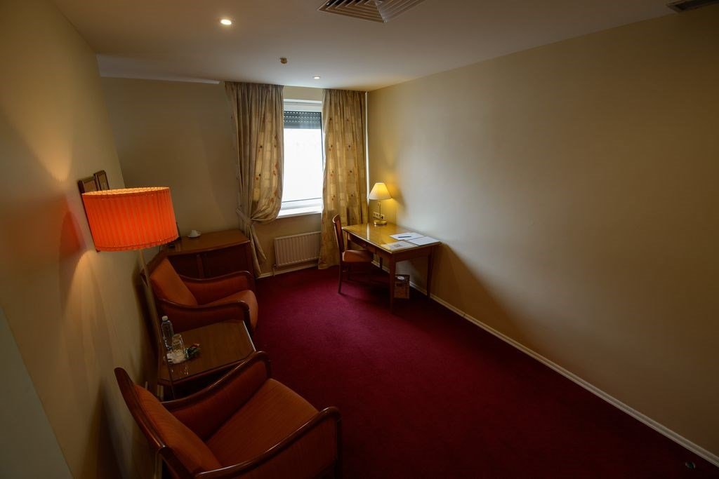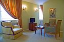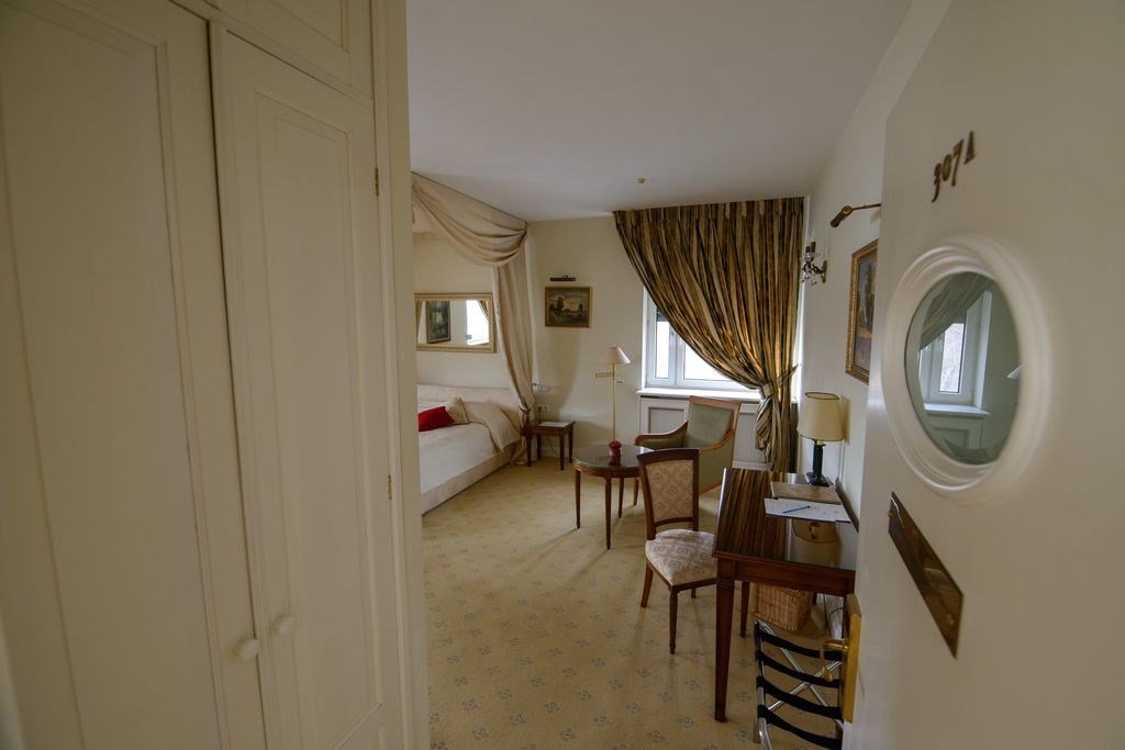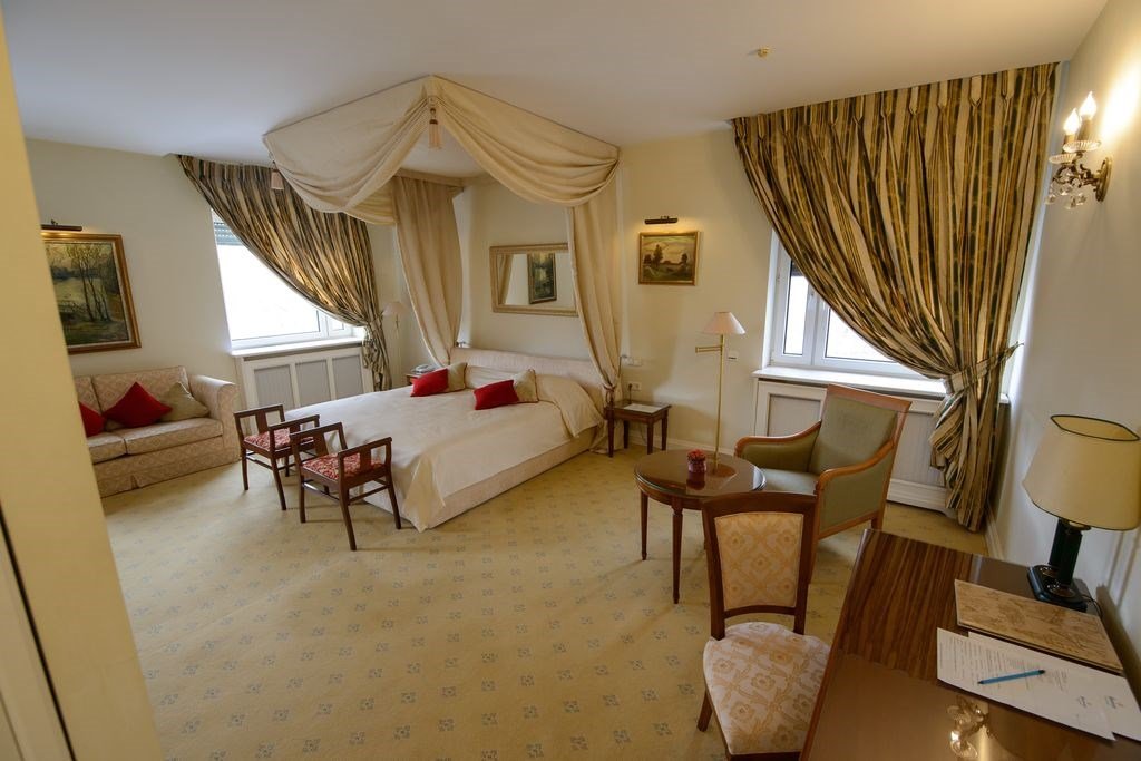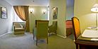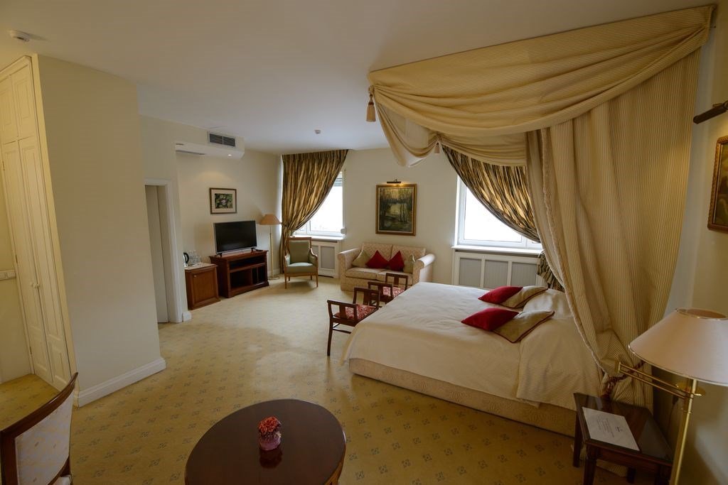 кабельное телевидение, Wi-Fi, телефон, кондиционер, фен, ванна, халаты, банные полотенца, тапочки, двуспальная кровать, кресла, журнальный столик, письменный стол, мини-бар, сейф, вид во двор, туалетные средстваВ гостиничном номере