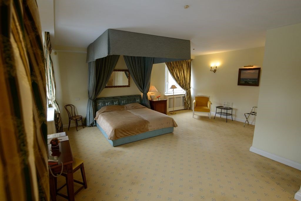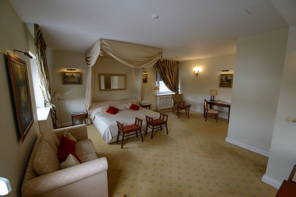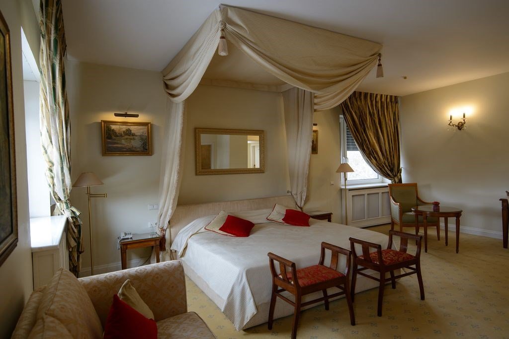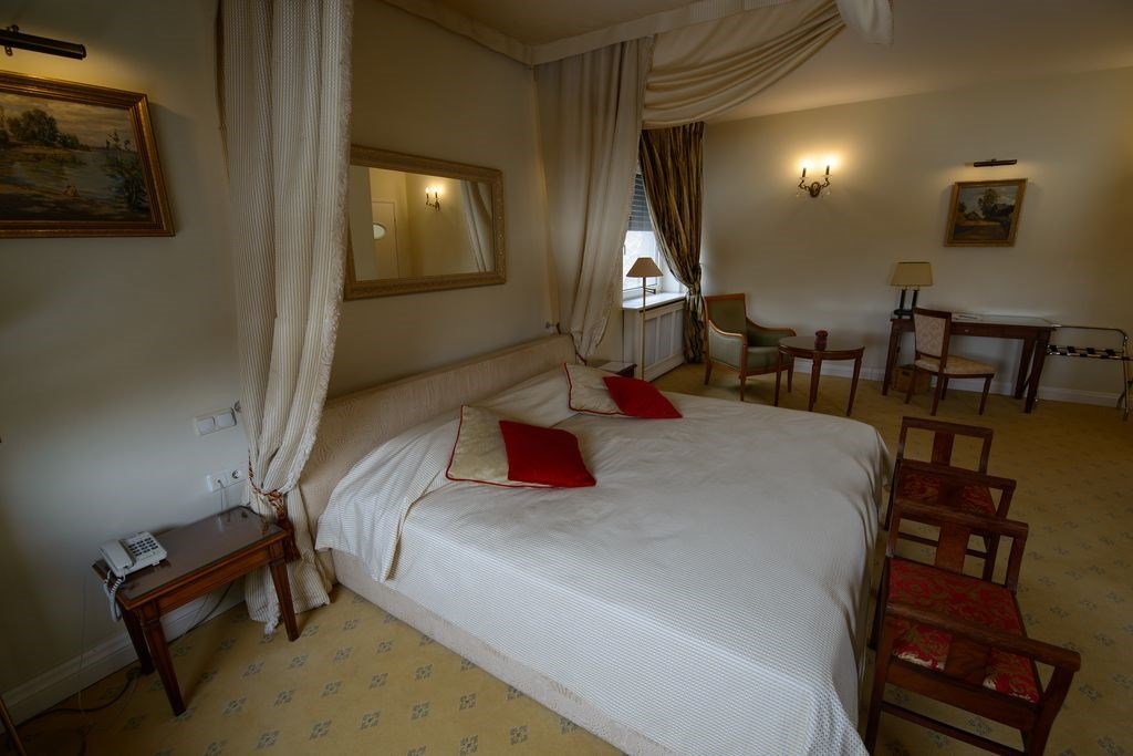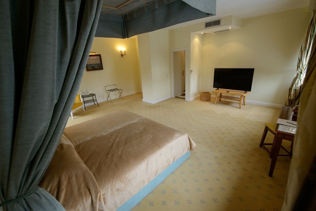 кабельное телевидение, Wi-Fi, телефон, кондиционер, фен, будильник, ванная комната, ванна, халаты, банные полотенца, тапочки, двуспальная кровать, кресла, журнальный столик, письменный стол, мини-бар, сейф, вид на сад, кресло, вид во двор, туалетные средстваВ гостиничном номере